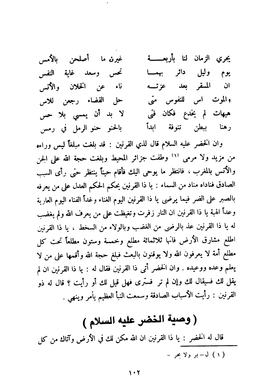ولا مرمى وطفت جزائر المحيط وبلغت حجة الله على الجن والأنس بالمغرب، فانتظر ما يوحى إليك فأقام حيناً ينتظر حتى رأى السبب الصادق فناداه مناد من السماء: يا ذا القرنين اليوم الغناء وغداً الفناء اليوم العارية وغداً الهبة يا ذا القرنين إن النار زفرت وتغيظت على من يعرف الله ولم يغضب له يا ذا القرنين عذ بالرضى من الغضب وبالولاء من السخط، يا ذا القرنين اطلع مشارق الأرض فإنها ثلاثمائة مطلع وخمسة وستون مطلعاً تحت كل مطلع أمة لا يعرفون الله ولا يقنون بالبعث فبلغ حجة الله وأقمها على من لا يعلم وعده ووعيده. وإن الخضر أتى ذا القرنين فقال له: يا ذا القرنين إن لم يقل لك فسيقال لك وإن لم تر فسترى فهل قيل لك أو رأيت؟ قال له ذو القرنين: رأيت الأسباب الصادقة وسمعت النبأ العظيم يأمر وينهي.
