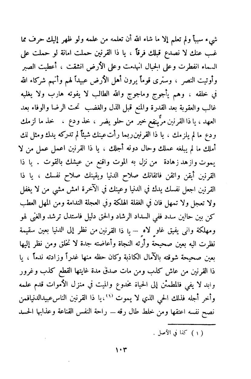 شيء سبباً ولم تعلم إلا ما شاء الله أن تعلمه من علمه ولو ظهر إليك حرف مما غب عنك لا نصدع قبلك فرقاً، يا ذا القرنين حملت أمانة لو حملت على السماء انفطرت وعلى الجبال انهدمت وعلى الأرض انشقت، أعطيت الصبر وأوتيت النصر، وسترى قوماً يرون أهل الأرض عبيداً وأنهم شركاء الله في خلقه، وهم يأجوج ومأجوج والله الطالب لا يفوته هارب ولا يغلبه غالب والعقوبة بعد القدرة والمنع قبل الذل والغضب تحت الرضا والوفاء بعد العهد، يا ذا القرنين مرٌّ ينفع خير من حلو يضر، خذ ودع، خذ ما لزمك ودع ما لم يلزمك، يا ذا القرنين ربما رأت عينك شيئاً لم تدركه يدك ومثل لك أملك ما لم يبلغه عملك وحال دونه أجلك، يا ذا القرنين اعمل عمل من لا يموت وازهد زهادة من نزل به الموت واقنع من عيشك بالقوت. يا ذا القرنين أيقن وأتقن فإتقانك صلاح الدنيا ويقينك