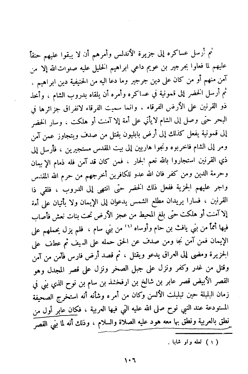 ثم أرسل عساكره إلى جزيرة الأندلس وأمرهم أن لا يبقوا عليهم حنقاً عليهم لما فعلوا بجرجير بن عويم داعي إبراهيم الخليل عليه صلوات الله إلا من آمن منهم أو من كان على دين جرجير وما دعا إليه من الحنفية دين إبراهيم. ثم أرسل الخضر إلى قمونية في عساكره وأمره أن يلقاه بدروب الشام، وأخذ ذو القرنين على ألأرض الفرقاء، وإنما سميت الفرقاء لانفراق جزائرها في البحر حتى وصل إلى الشام لا يأتي على أمة إلا آمنت أو هلكت، وسار الخضر إلى قمونية يفعل كذلك إلى أرض بابليون يقتل من صدف ويتجاوز عمن آمن ومر إلى الشام فاخربوه ونجوا هاربين إلى بيت المقدس مستجيرين، فأرسل إلى ذي القرنين استجاروا بالله نعم الجار، فمن كان قد آمن فله ذمام الإيمان وحرمة الدين ومن كفر فإن الله عدو للكافرين أخرجهم من حرم الله المقدس واجر عليهم الجزية ففعل ذلك الخضر حتى انتهى إلى الدروب، فلقي ذا القرنين، فسارا يريدان مطلع الشمس يدعوان إلى الإيمان ولا يأتيان على أمة إلا آمنت أو هلكت حتى بلغ المحيط من عجز الأرض تحت بنات نعش فأصاب فيها أمماً من بني يافث بن حام وأوساه من بني سام، فلم يزل يحملهم على الإيمان فمن آمن نجا ومن صدف عن الحق حمله على السيف ثم عطف على الجزيرة ومضى إلى الرعاق يدعو ويقتل، ثم قصد أرض فارس فآمن من آمن وقتل من غدر وكفر ونزل على جبل الصخر ونزل على قصر المجدل وهو القصر الأبيض قصر عابر بن شالخ بن ارفخشد بن سام بن نوح الذي بنى في زمان البلبلة حين تبلبلت الألسن وكان من أمره وشأنه إنه استخرج الصحيفة المستودعة عند النبي صلى الله عليه التي فيها العربية، فكان عابر أول من نطق بالعربية ونطق بها معه هود عليه الصلاة السلام، وذلك إنه لما بنى