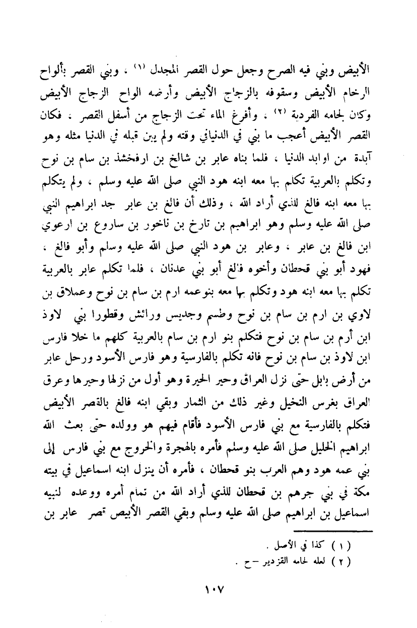 الأبيض وبني فيه الصرح وجعل حول القصر المجدل، وبني القصر بألواح الرخام الأبيض وسقوفه بالزجاج الأبيض وأرضه ألواح الزجاج الأبيض وكان لجامه الفردية، وأفرغ الماء تحت الزجاج من أسفل القصر، فكان القصر الأبيض أعجب ما بنى في الدنيا في وقته ولم يبن قبله في الدنيا مثله وهو أبدة من أوابد الدنيا، فلما بناه عابر بن شالخ بن ارفخشد بن سام بن نوح وتكلم بالعربية تكلم بها معه ابنه هود النبي صلى الله عليه وسلم، ولم يتكلم بها معه ابنه فالغ للذي أراد الله، وذلك أن فالغ بن عابر جد إبراهيم النبي صلى الله عليه وسلم وهو إبراهيم بن تارخ بن ناخور بن ساروع بن ارعوي ابن فالغ بن عابر، وعابر بن هود النبي صلى الله عليه وسلم وأبو فالغ، فهود أبو بني قحطان وأخوه فالغ أبو بني عدنان، فلما تكلم عابر بالعربية تكلم بها معه ابنه هود وتكلم بها معه بنو عمه ارم بن سام ين نوح وعملاق بن لاوي بن ارم بن سام بن نوح وطسم وجديس ورائش وقطورا بني لاوذ ابن ارم بن سام بن نوح فتكلم بنو ارم بن سام بالعربية كلهم ما خلا فارس بن لاوذ بن سام بن نوح فانه تكلم بالفارسية وهو فارس الأسود ورحل عابر من ارض بابل حتى نزل العراق وحير الحيرة وهو أول من نزلها وحيرها وعرق العراق بغرس النخيل وغير ذلك من الثمار وبقي ابنه فالغ لأقصر الأبيض فتكلم بالفارسية مع بني فارس الأسود فأقام فيهم هو وولده حتى بعث الله إبراهيم الخليل صلى الله عليه وسلم فأمره بالهجرة والخروج مع بني فارس إلى بني عمه هود وهم العرب بنو قحطان، فأمره أن ينزل ابنه إسماعيل في بيته مكة في بني جرهم بن قحطان للذي أراد الله من تمام أمره ووعده لنبيه إسماعيل بن إبراهيم صلى الله عليه وسلم وبقي القصر الأبيض قصر عابر بن