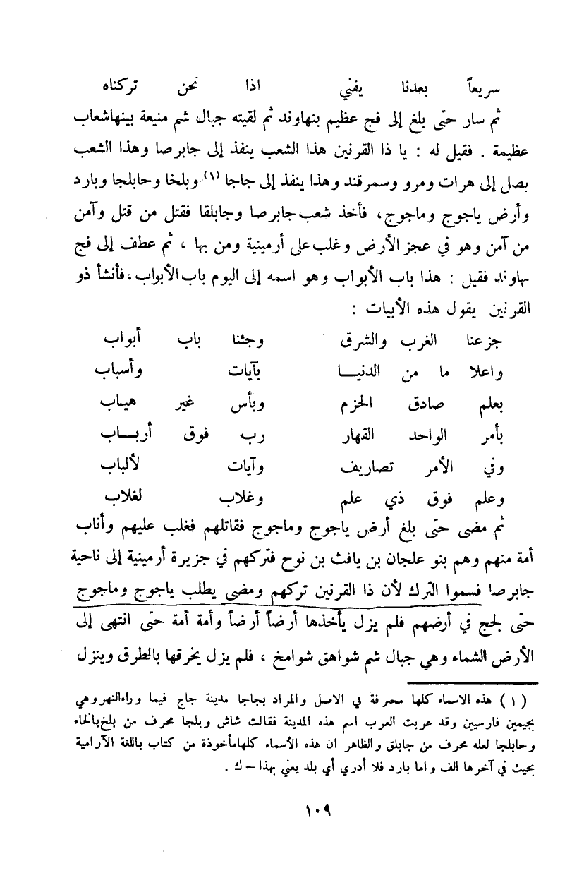 يأجوج ومأجوج، فأخذ شعب جابرصا وجابلقا فقتل من قتل وآمن ومن آمن وهو في عجز الأرض وغلب على أرمينية ومن بها، ثم عطف إلى فج نهاوند فقيل: هذا باب الأبواب وهو اسمه إلى اليوم بابا الأبواب، فأمشأ ذو القرنين يقول هذه الأبيات: