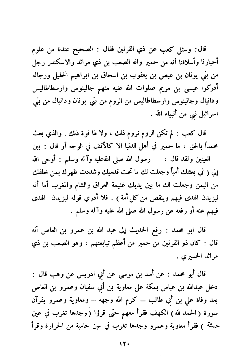 قال: وسئل كعب عن ذي القرنين فقال: الصحيح عندنا من علوم أحبارنا وأسلافنا إنه من حمير وانه الصعب بن ذي مراثد والاسكندر رجل من بني يونان بن عيص بن يقوب بن إسحاق بن إبراهيم الخليل ورجاله أدركوا عيسى بن مريم صلوات الله عليه منهم جالينوس وارسطاطاليس ودانيال وجالينوس وارسطاطاليس من الروم من بني يونان ودانيال من بني إسرائيل نبي من أنبياء الله.