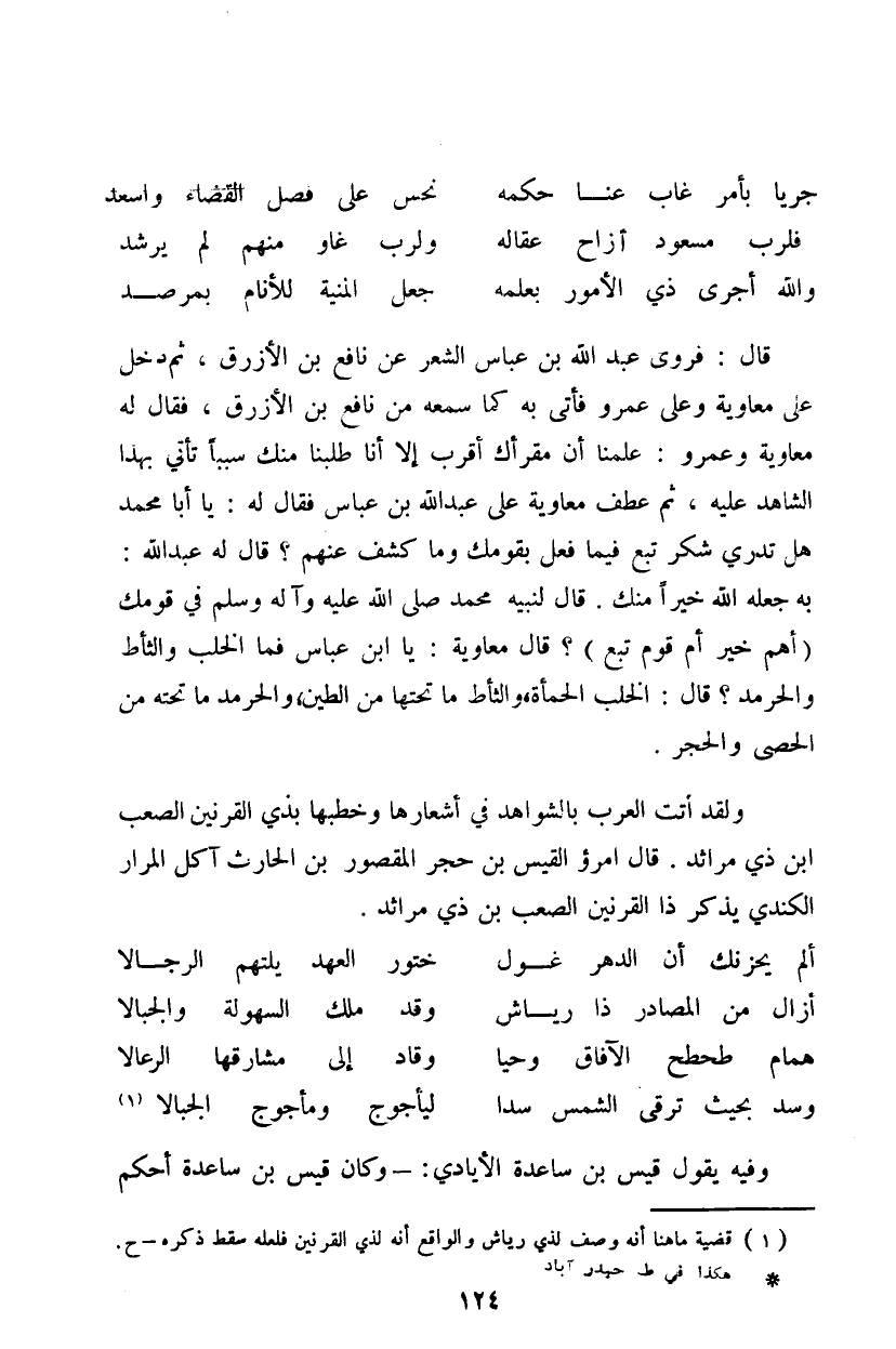 قال: فروى عبد الله بن عباس الشعر عن نافع بن الأزرق، ثم دخل على معاوية وعلى عمرو فأتى به كما سمعه من نافع بن الأزرق، فقال له معاوية وعمرو: علمنا أن مقرأك أقرب إلا أنا طلبنا منك سبباً تأتي بهذا الشاهد عليه، ثم عطف على عبد الله بن عباس فقال له: يا أبا محمد هل تدري شكر تبع فيما فعل بقومك وما كشف عنهم؟ قال له عبد الله: به جعله الله خيراً منك. قال لنبيه محمد صلى الله عليه وآله وسلم في قومك (أهم خير أم قوم تبع)؟ قال معاوية: يا ابن عباس فما الخلب والثأط والحرمد؟ قال: الخلب الحمأة، والثأط ما تحتها من الطين، والحرمد ما تحته من الحصى والحجر.
