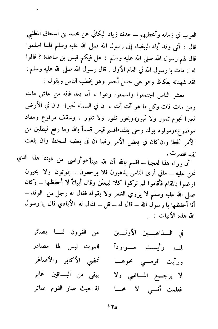 العرب في زمانه وأخطبهم - حدثنا زياد البكائي عن محمد بن إسحاق المطلبي قال: أتى وفد أياد البيضاء إلى رسول الله صلى الله عليه وسلم فلما اسلموا قال لهم رسول الله صلى الله عليه وسلم: هل فيكم قيس بن ساعدة؟ قالوا له: مات يا رسول الله في العام الأول. قال رسول الله صلى الله عليه وسلم: لقد شهدته بعكاظ وهو على جمل أحمر وهو يخطب الناس ويقول: