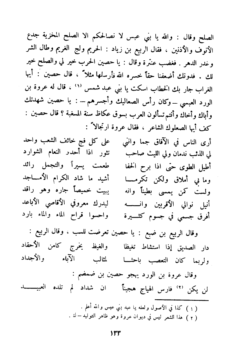 الصلح وقال: والله يا بني عبس لا نصالحكم إلا الصلح المخزية جدع الأنوف والأذنين، فقال الربيع بن زياد: الحريم ولج الغريم وطال الشر وغدر الدهر. فغضب عنترة وقال: يا حصين الحرب خير لي والصلح خير لك. فدونك أضعفنا حقاً خسره الله فأرسلها مثلاً، قال حصين: أيها الغراب جار بك الخطاب اسكت يا بني عبد شمس، قال له عروة بن الورد العبسي وكان رأس الصعاليك وأجسرهم: يا حصين شهدتك وأباك وأخاك وأنتم تسألون العرب بسوق عكاظ سنة المسبغة؟ قال حصين: كف أيها الصعلوك الشاعر، فقال عروة ارتجالاً: