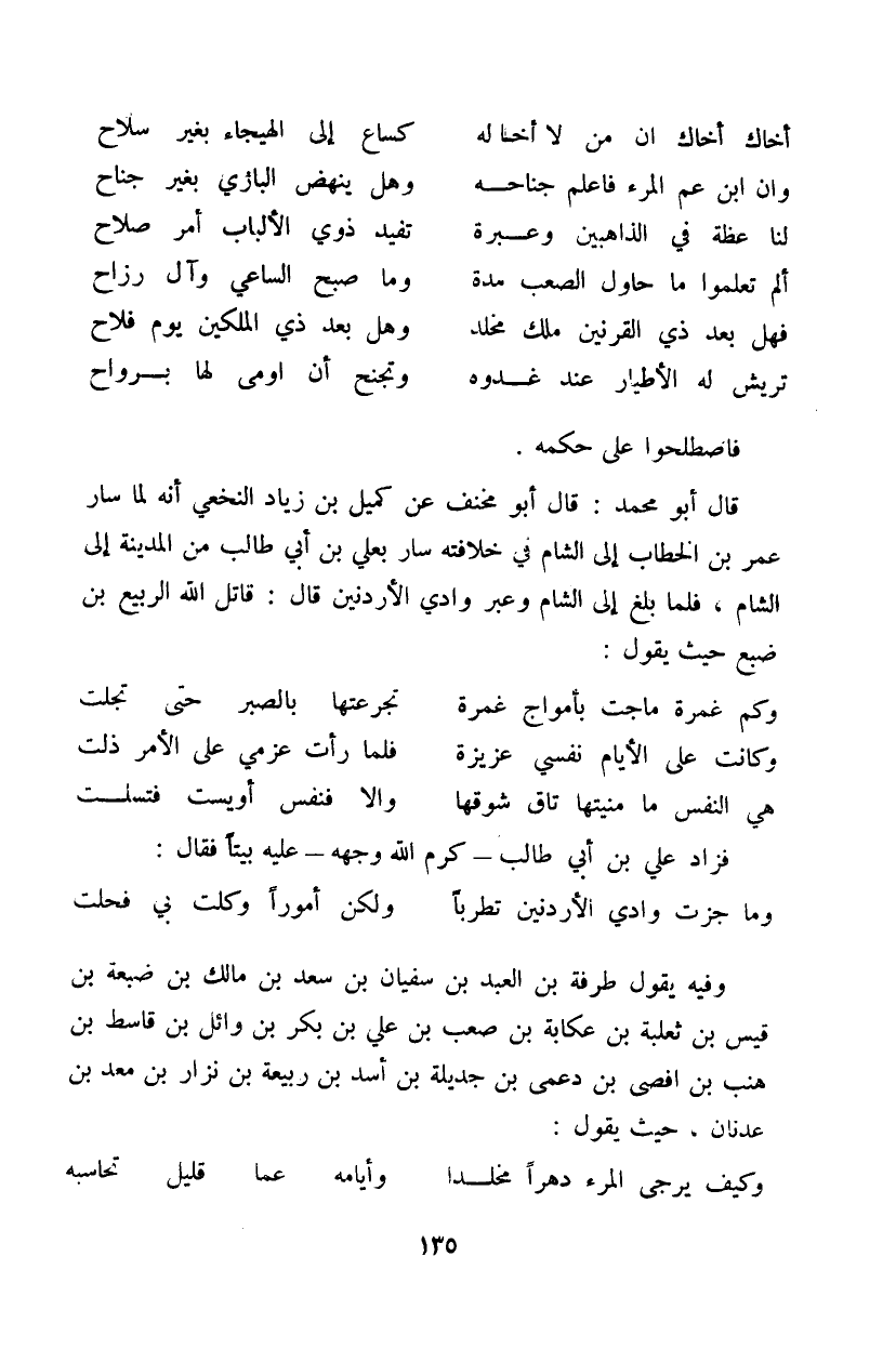 قال أبو محمد: قال أبو مخنف عن كميل بن زياد النخعي إنه لما سار عمر بن الخطاب إلى الشام في خلافته سار بعلي بن أبي طالب من المدينة إلى الشام، فلما بلغ إلى الشام وعبر وادي الأردنين قال: قاتل الله الربيع بن ضبع حيث يقول: