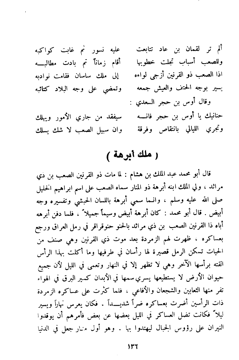 قال أبو محمد عبد الملك بن هشام: لما مات ذو القرنين الصعب بن ذي مراثد، ولي الملك ابنه أبرهة ذو المنار سماه الصعب على اسم إبراهيم الخليل صلى الله عليه وسلم، وإنما سمي أبرهة باللسان الحبشي وتفسيره وجه أبيض. قال أبو محمد: كان أبرهة أبيض وسيماً جميلاً، فلما دفن أبرهة أباه ذا القرنين الصعب بن ذي مراثد بالحنو حنوقراقر في رمل العراق ورجع بعساكره، ظهرت لهم الزمردة بعد موت ذي القرنين وهي صنف من الحيات تسكن الرمل قصيرة لها رأسان في طرفيها وما أكلت بهذا الرأس ألقته برأسها الآخر وهي لا تظهر إلا في النهار وتعمى في الليل لأن جميع حيوان الأرض لا يستطيعها يسري سمها في الأبدان كسير البرق في الهواء تفر منها الثعابين والشجعان والأفاعي، فلما كثرت على عساكره الزمردة ذات الرأسين أضرت بعساكره ضراً شديداً، فكان يعرس نهاراً ويسير ليلاً فكانت تضل العساكر في الليل بعضها عن بعض فأمرهم أن يوقدوا النيران على رؤوس الجبال ليهتدوا بها. وهو أول منار جعل في الدنيا
