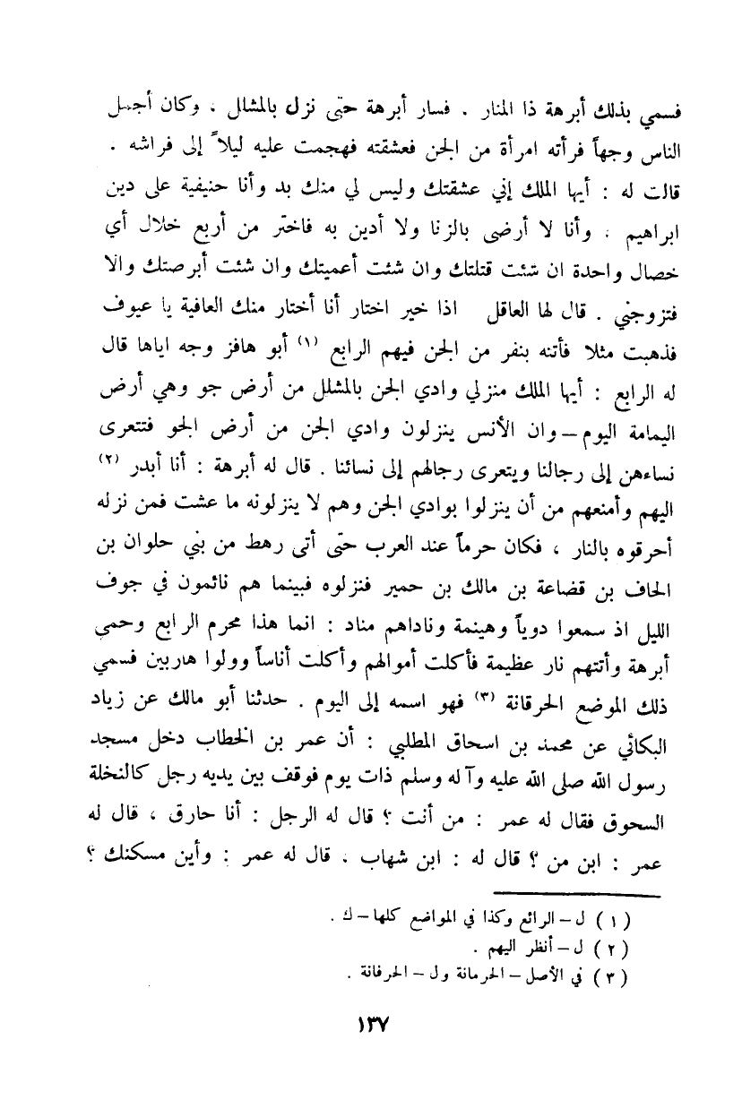 وإن شئت أبرصتك وإلا فتزوجني. قال لها العاقل إذا خير اختار أنا أختار منك العافية يا عيوف فذهبت مثلا فأتته بنفر من الجن فيهم الرابع أبو هافز وجه إياها قال له الرابع: أيها الملك منزلي وادي الجن بالمشلل من أرض جو وهي أرض اليمامة اليوم وإن الأنس ينزلون وادي الجن من أرض الجو فتتعرى نساءهن إلى رجالنا ويتعرى رجالهم إلى نسائنا. قال له أبرهة: أنا أبدر إليهم وأمنعهم من أن ينزلوا بوادي الجن وهم لا ينزلونه ما عشت فمن نزله أحرقوه بالنار، فكان حرماً عند العرب حتى أتى رهط من بني حلوان بن الحاف بن قضاعة بن مالك بن حمير فنزلوه فبينما هم نائمون في جوف الليل إذ سمعوا دوياً وهينمة ناداهم مناد: إنما هذا محرم الرابع وحمى أبرهة وأتتهم نار عظيمة فأكلت أموالهم وأكلت أناساً وولوا هاربين فسمي ذلك الموضع الحرقانة فهو اسمه إلى اليوم. حدثنا أبو مالك عن زياد البكائي عن محمد بن إسحاق المطلبي: أن عمر بن الخطاب دخل مسجد رسول الله صلى الله عليه وآله وسلم ذات يوم فوقف بين يديه رجل كالنخلة السحوق فقال له عمر: من أنت؟ قاتل له الرجل: أنا حارق، قال له عمر: ابن من؟ قال له: ابن شهاب. قال له عمر: وأين مسكنك؟