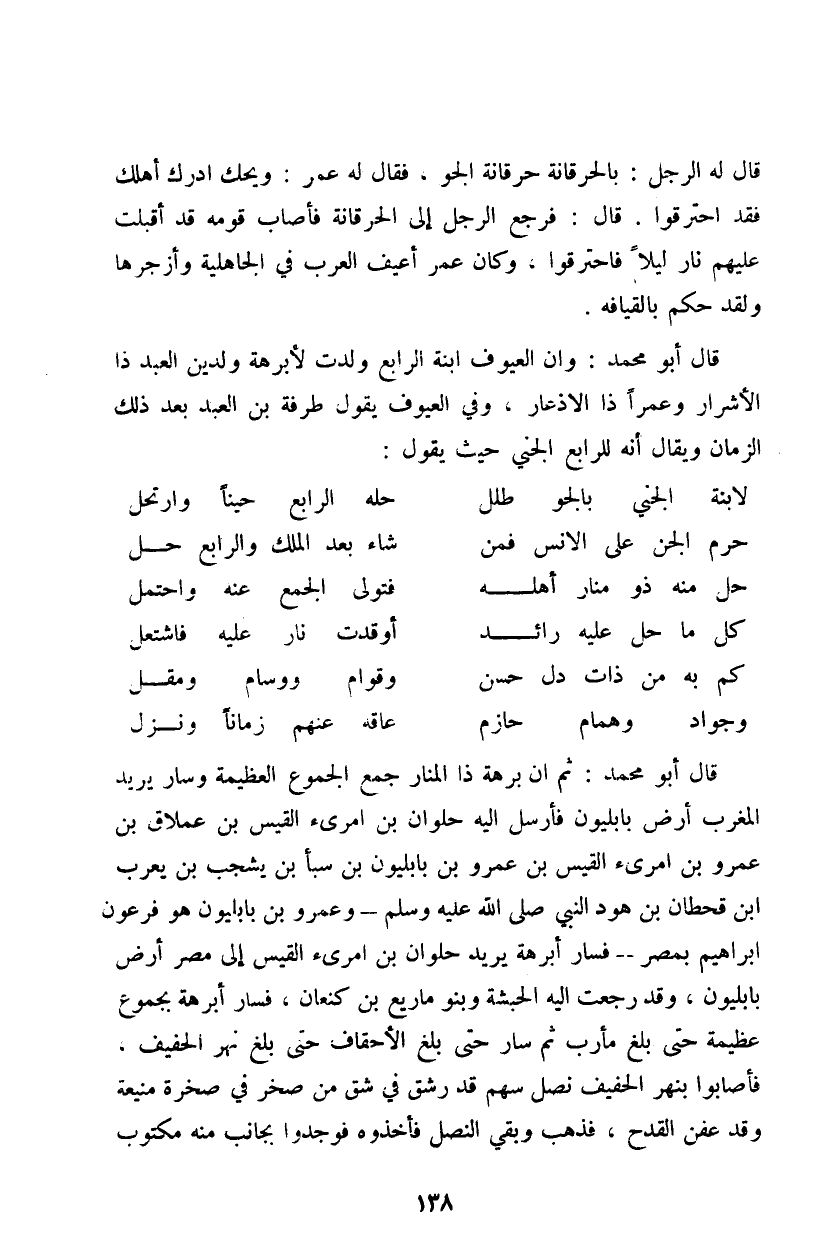 قال أبو محمد: ثم أن إبرهة ذا المنار جمع الجموع العظيمة وسار يريد المغرب أرض بابليون فأرسل إليه حلوان امرئ القيس بن عملاق بن عمرو بن امرئ القيس بن عمرو بن بابليون بن سبأ بن يشجب بن يعرب ابن قحطان بن هود النبي صلى الله عليه وسلم - وعمرو بن بابليون هو فرعون إبراهيم بمصر - فسار أبرهة يريد حلوان بن امرئ القيس إلى مصر أرض بابليون، وقد رجعا إليه الحبشة وبنو ماريع بن كنعان، فسار أبرهة بجموع عظيمة حتى بلغ مأرب ثم سار حتى بلغ الأحقاف حتى بلغ نهر الحفيف. فأصابوا بنهر الحفيف نصل سهم قد رشق في شق من صخر في صخرة منيعة وقد عفن القدح، فذهب وبقي النصل فأخذوه فوجدوا بجانب منه مكتوب