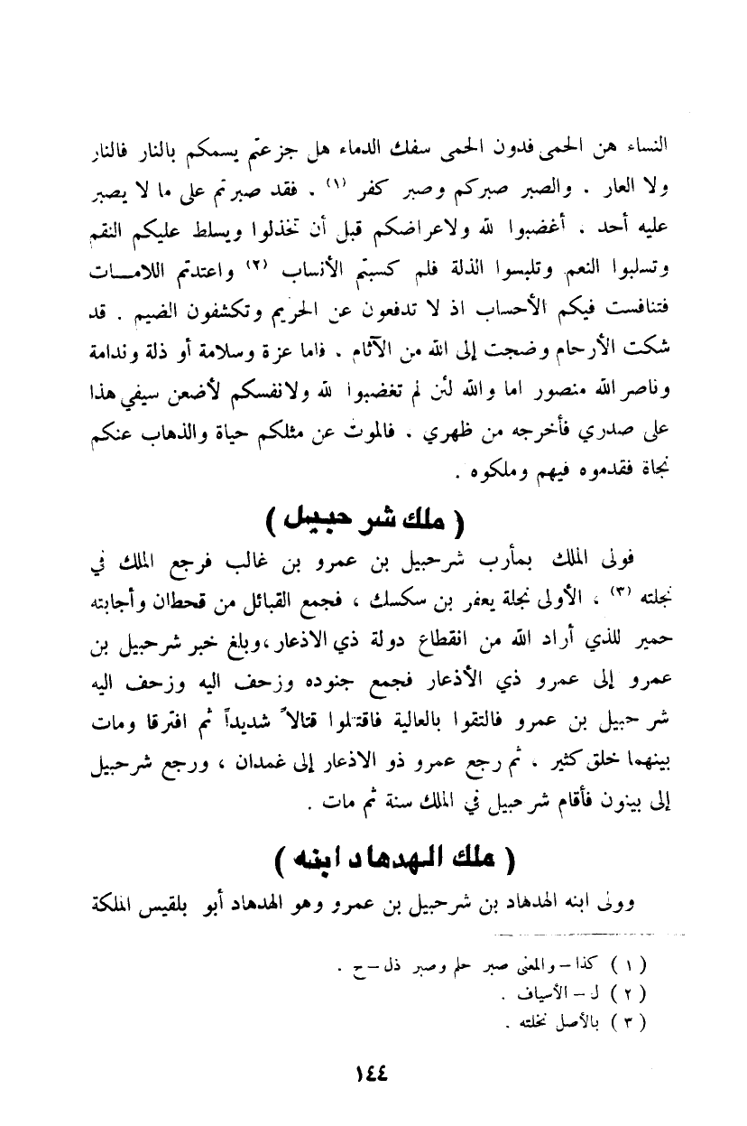 النساء هن الحمى فدون الحمى سفك الدماء هل جزعتم يسمكم بالنار فالنار ولا العار. والصبر صبركم وصبر كفر. فقد صبرتم على ما لا يصبر عليه أحد. أغضبوا الله ولا عراضكم قبل أن تخذلوا ويسلط عليكم النقم وتسلبوا النعم وتلبسوا الذلة فلم كسبتم الأنساب واعتدتم اللامات فتنافست فيكم الأحساب إذ لا تدفعون عن الحريم وتكشفون الضيم. قد شكت الأرحام وضجت إلى الله من الآثام، فلما عزة