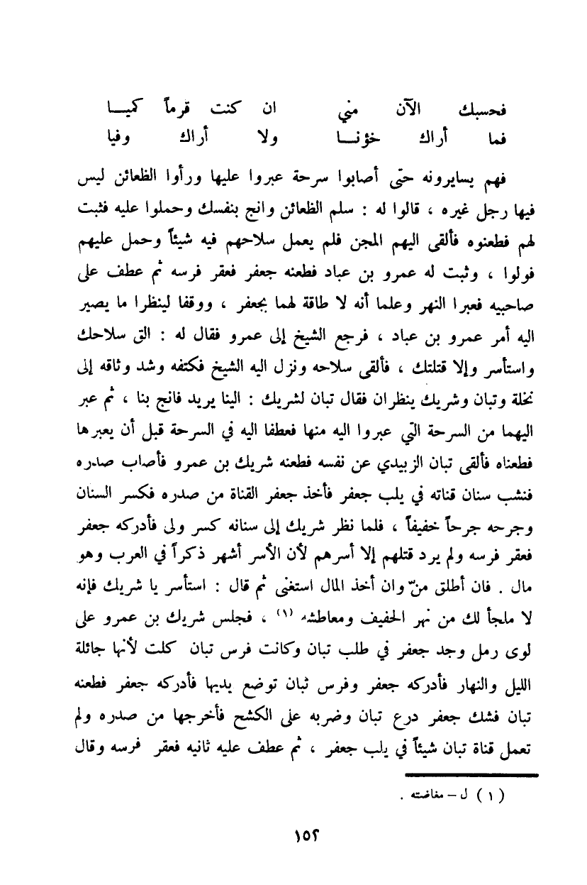 فأدركه جعفر فعقر فرسه ولم يرد قتلهم إلا أسرهم لأن الأسر أشهر ذكراً في العرب وهو مال. فإن أطلق منّ وإن أخذ المال استغنى ثم قال: استأسر يا شريك فإنه لا ملجأ لك من نهر الحفيف ومعاطشه، فجلس شريك بن عمرو على لوى رمل وجد جعفر في طلب تبان وكانت فرس تبان كلت لأنها جائلة الليل والنهار فأدركه جعفر وفرس تبان توضع يديها فأدركه جعفر فطعنه تبان فشك جعفر درع تبان وضربه على الكشح فأخرجها من صدره ولم تعمل قناة تبان شيئاً في يلب جعفر، ثم عطف عليه ثانية فعقر فرسه وقال