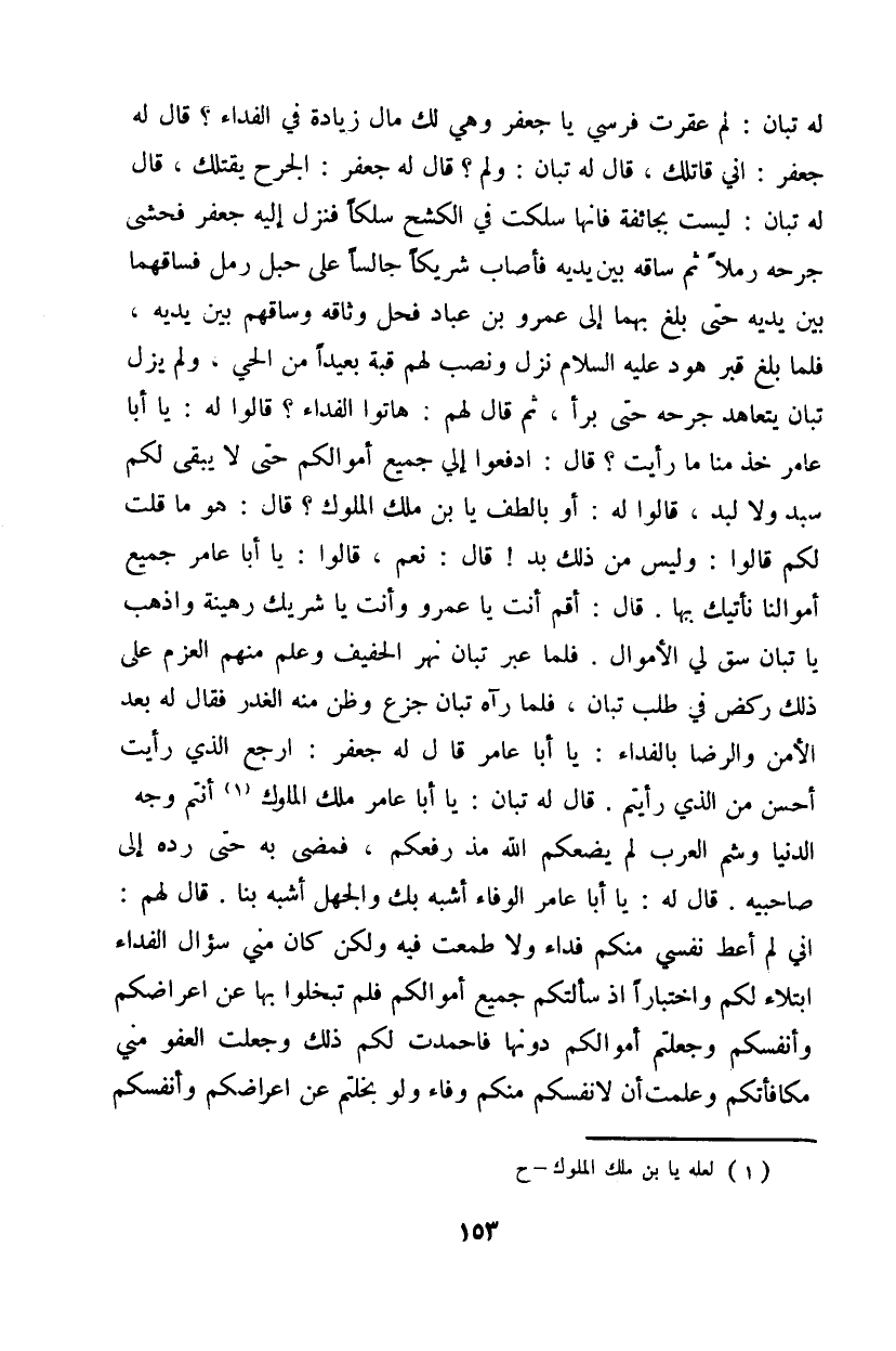 له تبان: لم عقرت فرسي يا جعفر وهي لك مال زيادة في الفداء؟ قال له جعفر: إني قاتلك، قال له تبان: ولم؟ قال له جعفر: الجرح يقتلك، قال له تبان: ليست بجائفة فإنها سكلت في الكشح سلكاً فنزل إليه جعفر فحشى جرحه رملاً ثم ساقه بين يديه فأصاب شريكاً جالساً على حبل رمل فساقهما بين يديه حتى بلغ بهما إلى عمرو بن عباد فحل وثاقه وساقهم بين يديه، فلما بلغ قبر هود عليه السلام نزل ونصب بهم قبة بعيداً من الحي، ولم يزل تبان يتعاهد جرحه حتى برأ، ثم قال لهم: هاتوا الفداء؟ قالوا له: يا أبا عامر خذ منا ما رأيت؟ قال: ادفعوا إلى الجميع أموالكم حتى لا يبقى لكم سبد ولا لبد، قالوا: أو بالطف يا بن ملك الملوك؟ قال: هو ما قلت لكم قالوا: وليس من ذلك بد! قال: نعم، قالوا: يا أبا عامر جميع أموالنا نأتيك بها. قال: أقم أنت يا عمرو وأنت يا شريك رهينة واذهب يا تبان سق لي الأموال. فلما عبر تبان نهر الحفيف وعلم منهم العزم على ذلك ركض في طلب تبان، فلما رآه تبان جزع وظن منه الغدر فقال له بعد الأمن والرضا بالفداء: يا أبا عامر قال له جعفر: ارجع الذي رأيت أحسن من الذي رأيتم. قال له تبان: يا أبا عامر ملك الملوك أنتم وجه الدنيا وشم العرب لم يضعكم الله مذ رفعكم، فمضى به حتى رده إلى صاحبيه. قال له: يا أبا عامر الوفاء أشبه بك والجهل أشبه بنا. قال لهم: أني لم أعط نفسي منكم فداء ولا