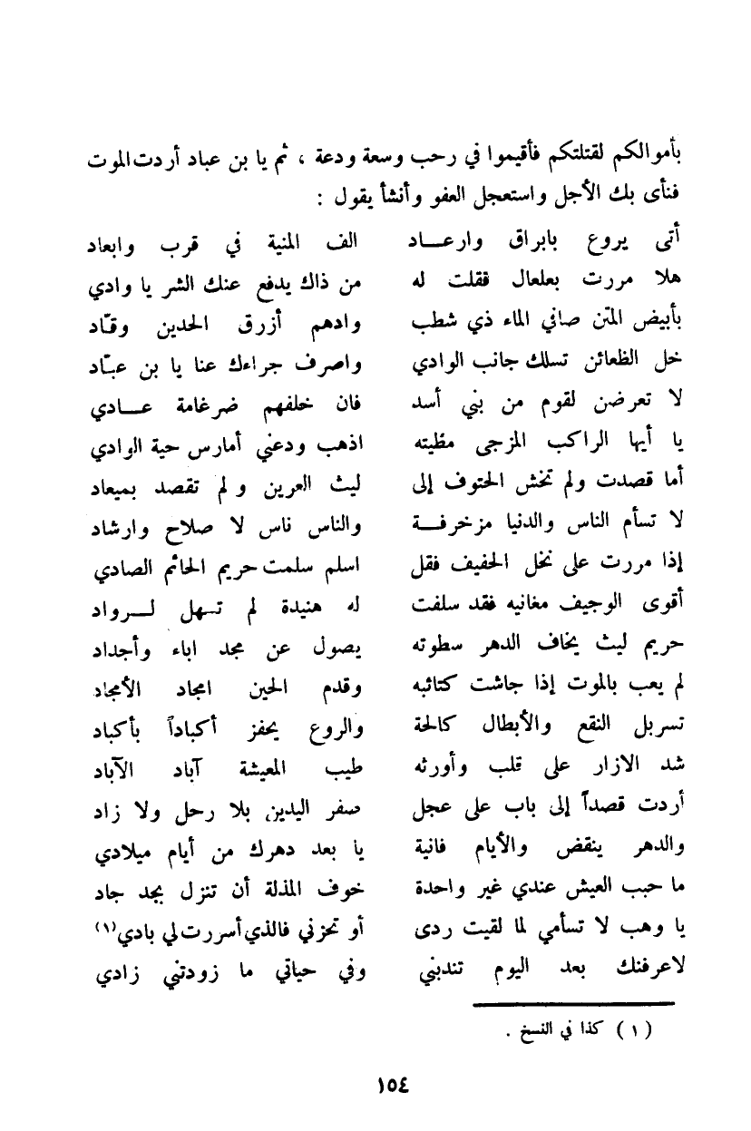 بأموالكم لقتلتكم فأقيموا في رحب وسعة ودعة، ثم يا بن عباد أردت الموت فنأى بك الأجل واستعجل العفو وأنشأ يقول:
