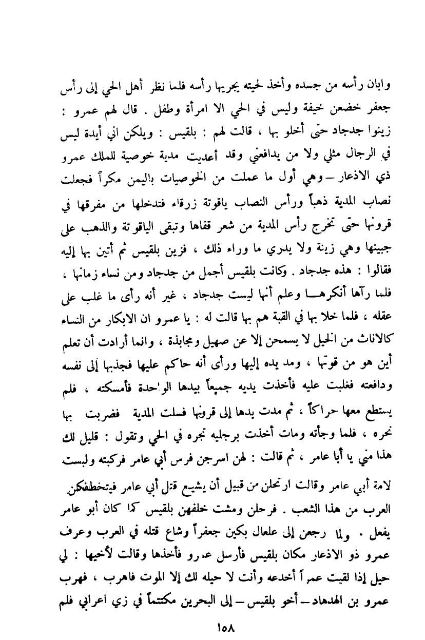 وأبان رأسه من جسده وأخذ لحيته يجريها رأسه فلما نظر أهل الحي إلى رأس جعفر خضعن خيفة وليس في الحي إلا امرأة وطفل. قال لهم عمرو: زينوا جدجاد حتى أخلو بها، قالت لهم: بلقيس: ويلكن اني أيدة ليس في الرجال مثلي ولا من يدافعني وقد أعديت مدية خوصية للملك عمرو ذي الاذعار - وهي أول ما عملت من الخوصيات باليمن مكراً فجعلت نصاب المدية ذهباً ورأس النصاب ياقوتة زرقاء فتدخلها من مفرقها في قرونها حتى تخرج رأس المدية من شعر قفاها وتبقى الياقوتة والذهب على جبينها وهي زينة لا يدري ما وراء ذلك، فزين بلقيس