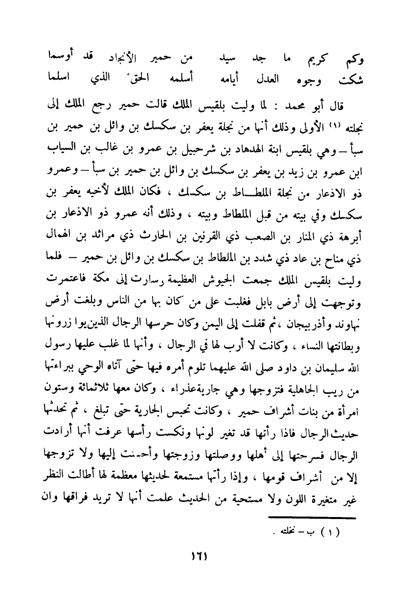 بها من الناس وبلغت أرض نهاوند وأذربيجان، ثم قفلت إلى اليمن وكان حرسها الرجال الذين يوازرونها وبطانتها النساء، وكانت لا أرب لها في الرجال، وأنها لما غلب عليها رسول الله سليمان بن داود صلى الله عليهما تلوم أمره فيها حتى آتاه الوحي ببراءتها من ريب الجاهلية فتزوجها وهي جارية عذراء، وكان معها ثلاثمائة وستون امرأة من بنات أشراف حمير، وكانت تحبس الجارية حتى تبلغ، ثم تحدثها حديث الرجال فإذا رأتها قد تغير لونها ونكست رأسها عرفت أنها أرادت الرجال فسرحتها إلى أهلها ووصلتها وزوجتها وأحسنت إليها ولا تزوجها إلا من أشراف قومها، وإذا رأتها مستمعة لحديثها معظمة لها أطالت النظر غير متغيرة اللون ولا مستحية من الحديث علمت أنها لا تريد فراقها وإن