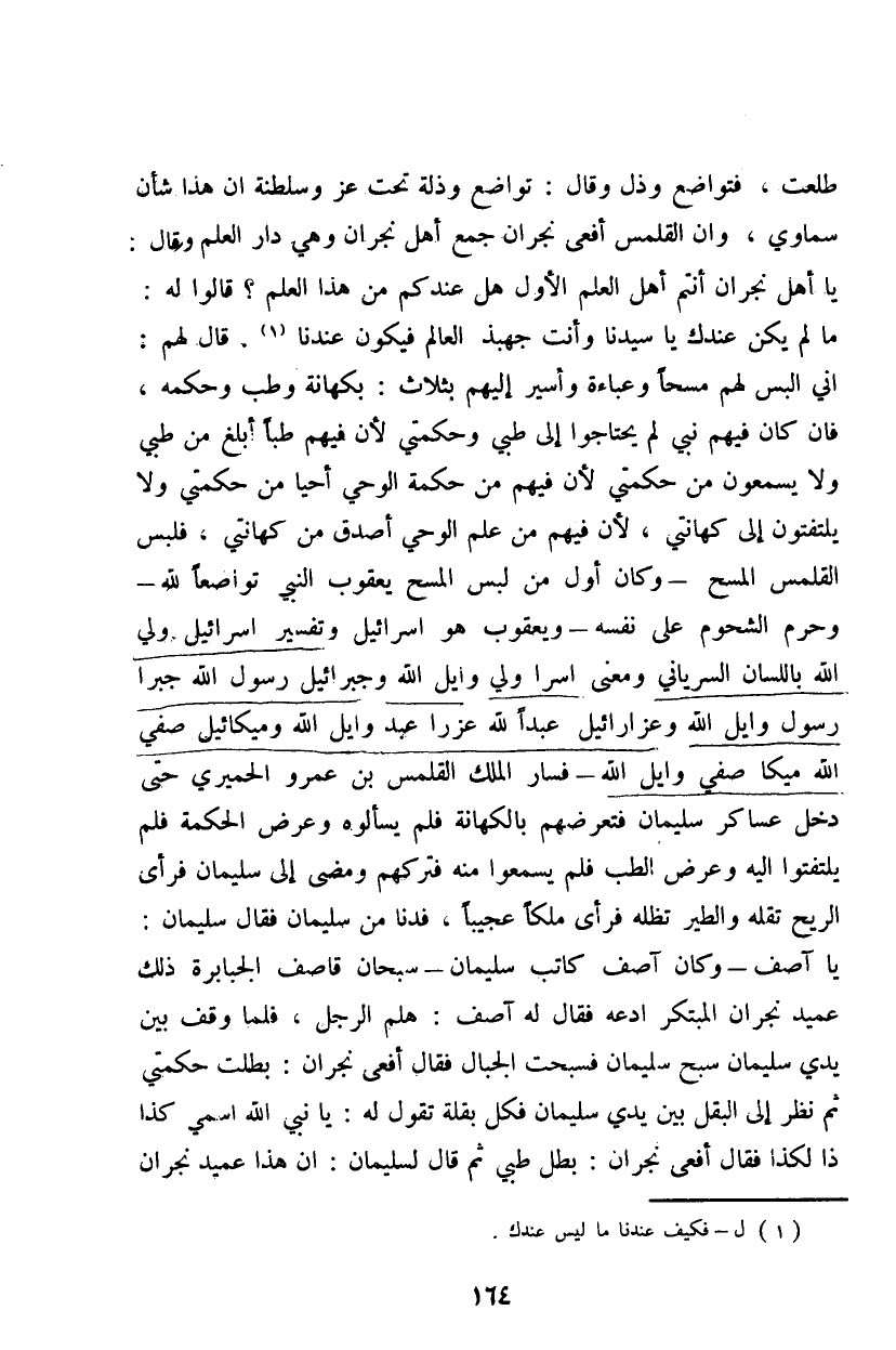 طلعت، فتواضع وذل وقال: تواضع وذلة تحت عز وسلطنة أن هذا شأن سماوي، وإن القلمس أفعى نجران جمع أهل نجران وهي دار العلم وقال: يا أهل نجران أنتم أهل العلم الأول هل عندكم من هذا العلم؟ قالوا له: ما لم يكن عندك يا سيدنا وأنت جهبذ العالم فيكون عندنا، قال لم: إني البس لهم مسا وباءة وأسير إليهم بثلاث: بكهانة وطب وحكمه، فإن كان فيهم نبي لم يحتاجوا إلى طبي وكمتي لأن فيم طبا أبلغ من طبي ولا يسمعون من حكمتي لأن فيهم من حكمة الوحي أحيا من حكمتي ولا يلتفتون إلى كهانتي، لأن فيهم من علم الوحي أصدق من كهانتي، فلبس القلمس المسح - وكان أول من لبس المسح يعقوب النبي تواضعاً لله - وحرم الشحوم لي نفس ويعقوب هو إسرائيل ولي الله باللسان السرياني ومعنى أسرا ولي وايل الله وجبرائيل رسول الله جبرا رسول وايل الله وعزارائيل عبداً لله عزرا عبد وايل الله وميكائيل صفي الله ميكا صفي وايل الله فسار الملك القلمس بن عمرو الحميري حتى دخل عساكر سليمان فتعرضهم بالكهانة فلم يسألوه وعرض الحكمة فلم يلتفتوا إليه وعرض الطب فلم يسمعوا منه فتركهم ومضى إلى سليمان فرأى الريح تقله والطير تظله فرأى ملكاً عجيباً، فدنا من سليمان فقال سليمان: يا آصف - وكان آصف كاتب سليمان - سبحان قاصف الجبابرة ذلك عميد نجران المبتكر ادعه فقال له آصف: هلم الرجل؟، فلما وقف بين يدي سليمان سبح سليمان فسبحت الجبال فقال أفعى نجران: بطلت حكمتي ثم نظر إلى البقل بين يدي سليمان فكل بقلة تقول له: يا نبي الله اسمي كذا ذا لكذا فقال أفعى نجران: بطل طبي ثم قال لسليمان: إن هذا