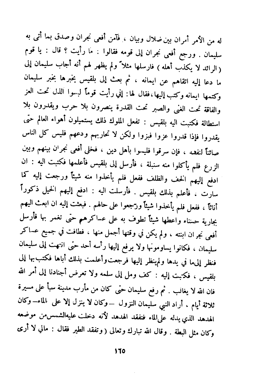 له من الأمر أمران بين ضلال وبيان، فآمن أفعى نجران وصدق بما أتى به سليمان. ورجع أفعى نجران إلى قومه فقالوا: ما رأيت؟ قال: يا قوم {الرائد لا يكذب أهله} فأرسلها مثلاً ول يظهر لهم إنه أجاب سليمان إلى ما دعا إليه اتقاهم عن إيمانه، ثم بعث إلى بلقيس يخبرها بخبر سليمان وكتمها إيمانه وكتب إليها، فقال لها: إني رأيت قوماً لبسوا الذل تحت العز والفاقة تحت الغنى والصبر تحت القدرة ينصرون بلا حرب ويقدرون بلا استطالة فكتبت إليه بلقيس: تفعل الملوك ذلك يستميلون أهواء العالم حتى يقدروا فإذا قدروا عزوا فبزوا ولكن لا تحاربهم ودعهم فليس كل الناس صائناً لنفسه، فإن سرقوا فليسوا بأهل دين، فخلى أفعى نجران بينهم وبين الزرع فلم يأكلوا منه سنبلة، فأرسل إلى بلقيس أعلمها فكتبت إليه: أن ادفع إليهم الخف والظلف ففعل فلم يأخذوا منه شيئاً ورجعت إليه كما سارت، فأعلم بذلك بلقيس. فأرسلت إليه: ادفع إليهم الخيل ذكوراً إناثاً، ففعل فلم يأخذوا شيئاً ورجعوا على حالهم. فبعثت إليه أن ابعث إليهم بجارية حسناء وأعطها شيئاً تطوف به على عساكرهم حتى تغمر بها فأرسل أفعى نجران ابنته، ولم يكن في وقتها أجمل منها، فطافت في جميع عساكر سليمان، فكانوا يساومونها ولا يرفع إليها رأسه أحد حتى انتهت إلى سليمان فنظر إلى مال في يدها ولم ينظر إليها فرجعت وأعلمت بذلك أباها فكتب بها إلى بلقيس، فكتبت إليه: كف ومل إلى سلمه ولا تعرض أجنادنا إلى أمر الله فإن الله لا يغالب. ثم رف سليمان حتى كان من مأرب مدينة سبأ على مسيرة ثلاثة أيام، أراد النبي سليمان النزول - وكان لا ينزل إلا على الماء - وكان الهدهد الذي يدله على الماء وكان الهدهد الذي يدله على الماء فتفقد الهدهد لأنه دخلت عليه الشمس من موضعه وكان مثل البطة. وقال الله تبارك وتعالى {وتفقد الطير فقال ما لي لا أرى