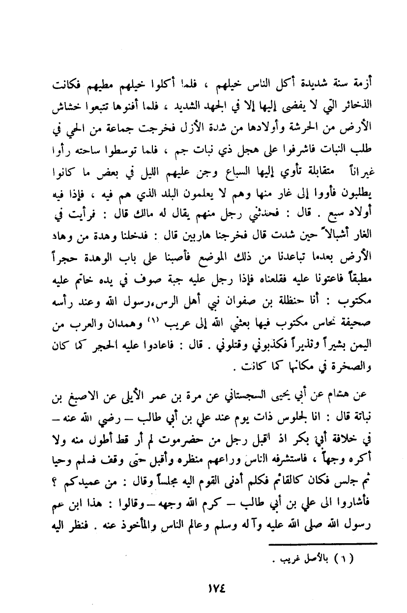 أفنوها تتبعوا خشاش الأرض من الحرشة وأولادها من شدة الأزل فخرجت جماعة من الحي في طلب النبات فاشرفوا على هجل ذي نبات جم، فلما توسطوا ساحته رأوا غيراناً متقابلة تأوي إليها السباع وجن عليهم الليل في بعض ما كانوا يطلبون فأووا إلى غار منها وهم لا يعلمون البلد الذي هم فيه، فإذا فيه أولاد سبع. قال: فحدثني رجل منهم يقال له مالك قال: فرأيت في الغار أشبالاً حين شدت قال فخرجنا هاربين قال: فدخلنا وهدة من وهاد الأرض بعدما تباعدنا من ذلك الموضع فأصبنا على باب الوهدة حجراً مطبقاً فاعتلونا عليه فقلعناه فإذا رجل عليه جبة صوف في يده خاتم عليه مكتوب: أنا حنظلة بن صفوان نبي أهل الرس، رسول الله وعند رأسه صحيفة نحاس مكتوب فيها بعثني الله إلى عريب وهمدان والعرب من اليمن بشيراً ونذيراً فكذبوني وقتلوني. قال: فأعادوا عليه الحجر كما كان والصخرة في مكانها كما كانت.