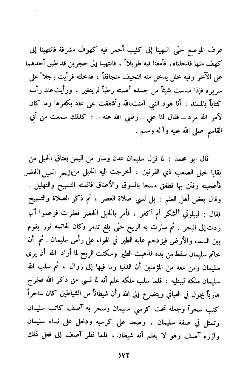 عرف الموضع حتى انتهينا إلى كثيب أحمر فيه كهوف مشرفة فانتهينا إلى كهف منها فدخلناه. فأمعنا فيه طويلاً، فانتهينا إلى حجرين قد طبق أحدهما على الآخر وفيه خلل يدخل منه النحيف متجانفاً، فدخلته فرأيت رجلاً على سريره فإذا مسست شيئاً من جسده أصبته رطباً لم يتغير، ورأيت عند رأسه كتاباً بالمسند: أنا هود النبي آمنت بالله وأشفقت على عاد بكفرها وما كان لأمر الله مرد فقال لنا علي - رضي الله عنه -: كذلك سمعت من أبي القاسم صلى الله عليه وآله وسلم.