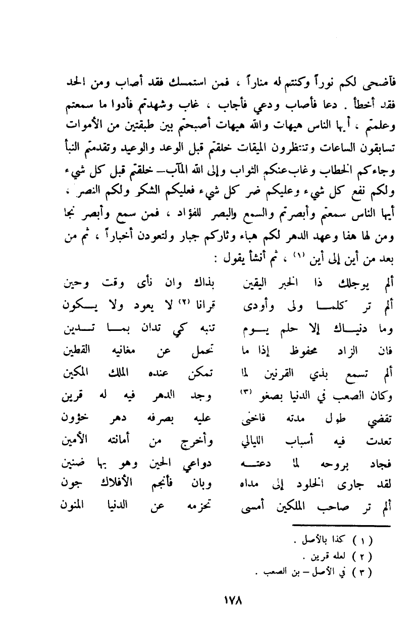 فأضحى لكم نوراً وكنتم له مناراً، فمن استمسك فقد أصاب ومن الحد فقد أخطأ. دعا فأصاب ودعي فأجاب، غاب وشهدتم فأدوا ما سمعتم وعلمتم، أيها الناس هيهات والله هيهات أصبحتم بين طبقتين من الأموات تسابقون الساعات وتنتظرون الميقات خلقتم قبل الوعد والوعيد وتقدمتم النبأ وجاءكم الخطاب وغاب عنكم الثواب وإلى الله المآب - خلقتم قبل كل شيء ولكم نفع كل شيء وعليكم ضر كل شيء فعليكم الشكر ولكم النصر، أيها الناس سمعتم وأبصرتم والسمع والبصر للفؤاد، فمن سمع وأبصر نجا ومن لها هفا وعهد الدهر لكم هباء وثأركم جبار ولتعودن أخباراً، ثم من بعد من أين إلى أين، ثم أنشأ يقول: