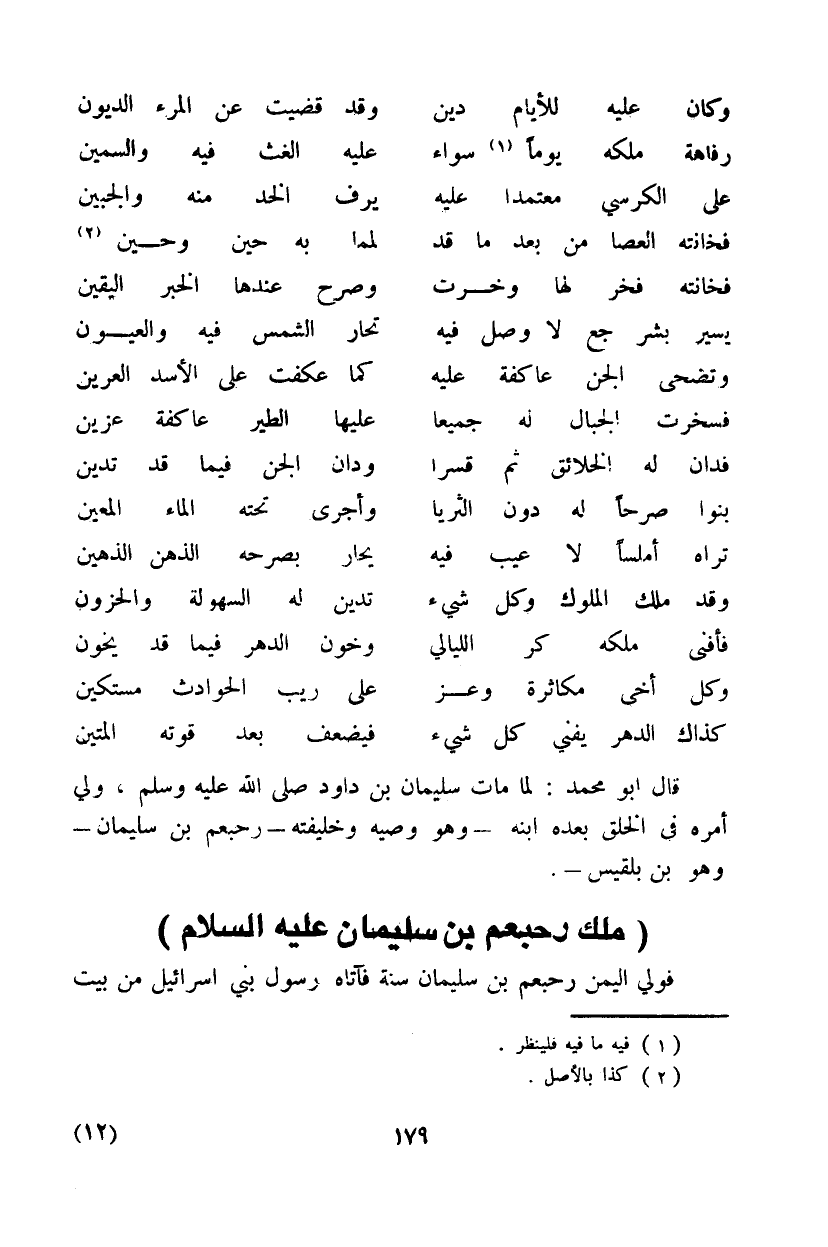 قال أبو محمد: لما مات سليمان بن داود صلى الله عليه وسلم، ولي أمره في الخلق ابنه - وهو وصيه وخليفته - رحبعم بن سليمان - وهو بن بلقيس -.