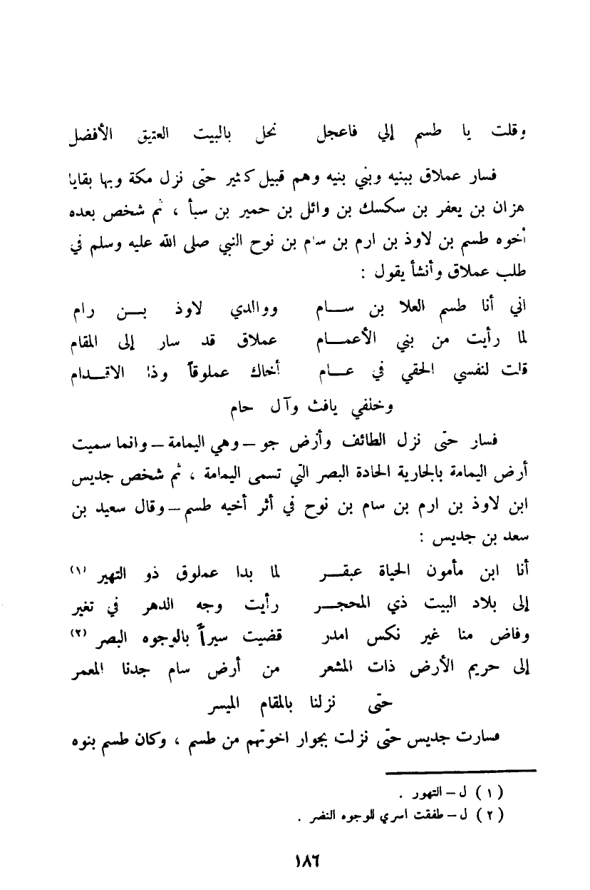 فسار عملاق ببنيه وبني بنيه وهم قبيل كثير حتى نزل مكة وبها بقايا هزان بن يعفر بن سكسك بن وائل بن حمير بن سبأ، ثم شخص بعده أخوه طسم بن لاوذ بن ارم بن سام بن نوح النبي صلى الله عليه وسلم في طلب عملاق وأنشأ يقول: