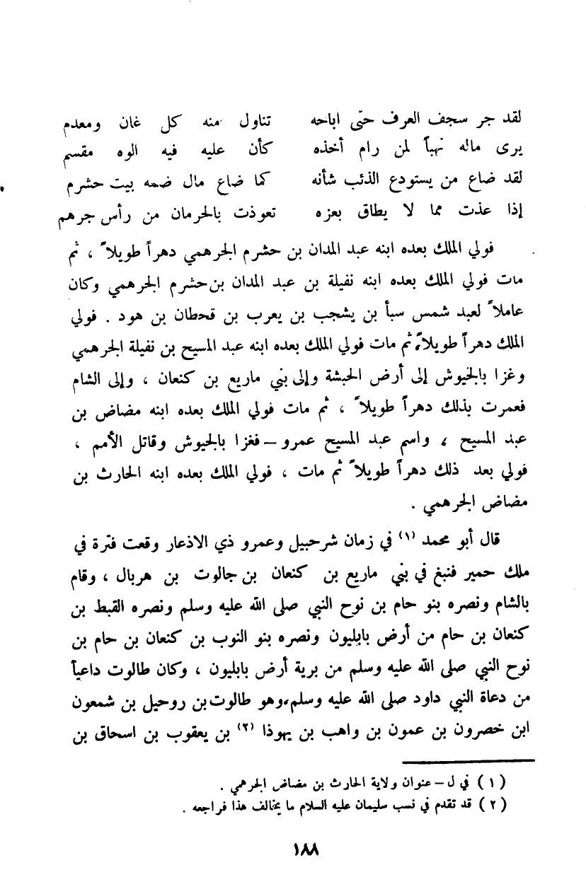 فولي الملك بعده ابنه عبد المدان بن حشرم الجرهمي دهراً طويلاً، ثم مات فولي الملك بعده ابنه نفيلة بن عبد المدان بن حشرم الجرهمي وكان عاملاً لعبد شمس سبأ بن يشجب بن يعرب بن قحطان بن هود. فولي الملك دهراً طويلاً، ثم مات فولي الملك بعده ابنه عبد المسيح بن نفيلة الجرهمي وغزا بالجيوش إلى أرض الحبشة وإلى بني ماريع بن كنعان، وإلى الشام فعمرت بذلك دهراً طويلاً، ثم مات فولي الملك بعده ابنه مضاض بن عبد المشيح، واسم عبد المسيح عمرو - فغزا بالجيوش وقاتل الأمم، فولي بعد ذلك دهراً طويلاً ثم مات، فولي الملك بعده ابنه الحارث بن مضاض الجرهمي.