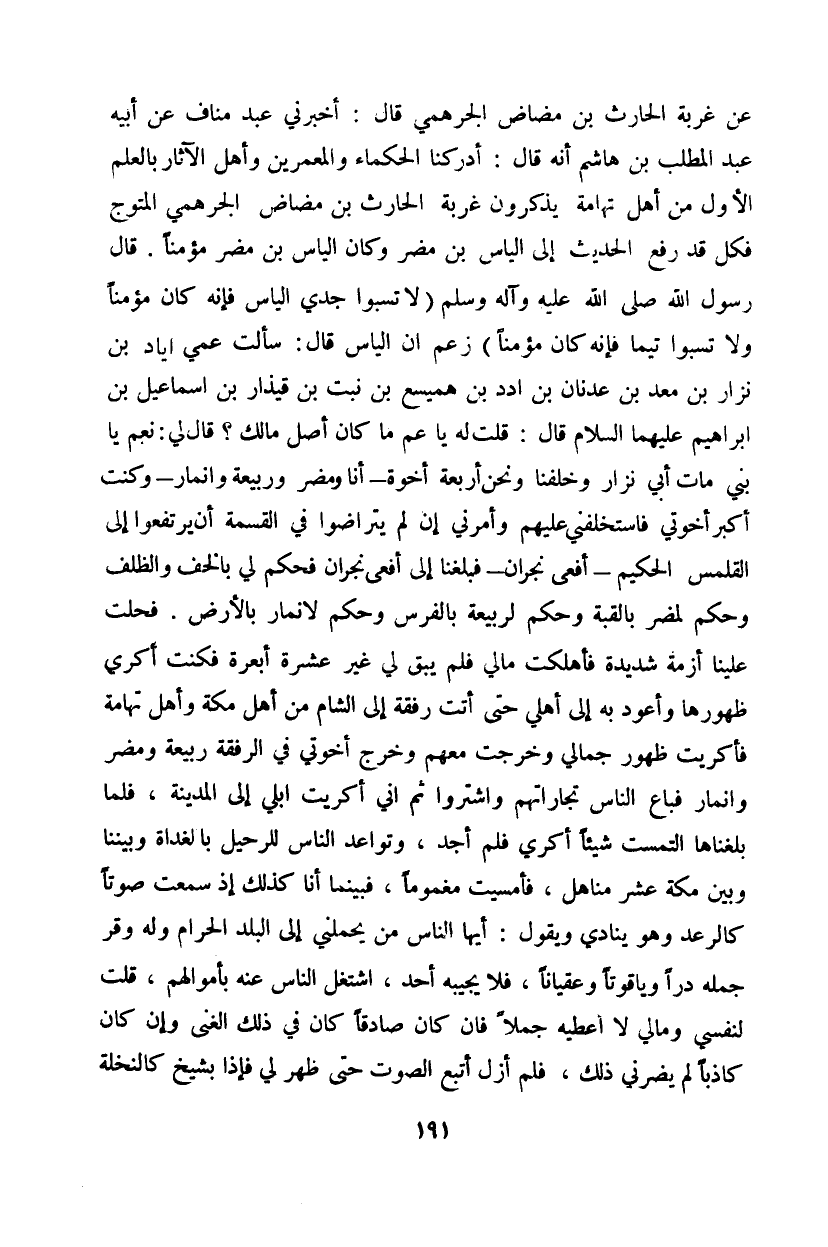 الحديث إلى الياس بن مضر وكان الياس بن مضر مؤمنا. قال رسول الله صلى الله عليه وآله وسلم (لا تسبوا جدي الياس فإنه كان مؤمناً ولا تسبوا تيما فإنه كان مؤمنا) زعم أن الياس قال: سالت عمي إياد بن نزار بن معد بن عدنان بن ادد بن همسيع بن نبت بن قيذار بن إسماعيل بن إبراهيم عليهما السلام قال: قلت له يا عم ما كان أصل مالك؟ قال لي: نعم يا بني مات أبي نزار وخلفنا ونحن أربعة أخوة - أنا ومضر وربيعة وانمار - وكنت أكبر أخوتي فاستخلفني عليهم وأمرني إن لم يتراضوا في القسمة أن يرتفعوا إلى القلمس الحكيم - أفعى نجران - فبلغنا إلى أفعى نجران فحكم لي بالخف والظلف وحكم لمضر بالقبة وحكم لربيعة بالفرس وحكم لانمار بالأرض. فحلت علينا أزمة شديدة فأهلكت مالي فلم يبق لي غير عشرة أبعرة فكنت أكري ظهورها وأعود به إلى أهلي حتى أتت رفقة إلى الشام من أهل مكة وأهل تهامة فأكريت ظهور جمالي وخرجت معهم وخرج أخوتي في الرفقة ربيعة ومضر وانمار فباع الناس تجاراتهم واشتروا ثم إني أكريت ابلي إلى المدينة، فلما بلغناها التمست شيئاً أكري فلم أجد، وتواعد الناس للرحيل بلغداة وبيننا وبين مكة عشر مناهل، فأمسيت مغموماً، فبنما أنا كذلك إذ سمعت صوتاً كالرعد وهو ينادي ويقول: أيها الناس من يحملني إلى البلد الحرام وله وقر جمله دراً وياقوتاً وعقياناً، فلا يجيبه أحد، اشتغل الناس عنه بأموالهم، قلت لنفسي ومالي لا أعطيه جملاً فإن كان صادقاً كان في ذلك الغنى وإن كان كاذباً لم يضرني ذلك، فلم أزل أتبع الصوت حتى ظهر لي فإذا بشيخ كالنخلة
