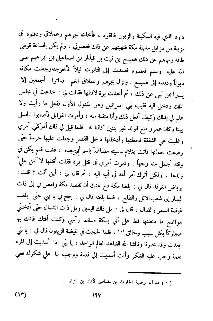 داود الذي فيه السكينة والزبور فالقوه، فأخذته جرهم وعملاق ودفنوه في مزبلة من مزابل مدينة مكة فنهيتهم عن ذلك فعصوني، ولم يكن لجماعة قومي طاقة ونهاهم عن ذلك همسيع بن نبت قيدار بن إسماعيل بن إبراهيم صلى الله عليه وسلم فعصوه فعمدت إلى التابوت ليلاً فأخرجته وجعلت مكانه تابوتاً ودفعته إلى همسيع. ونزل بجرهم وعملاق الغم أجمعين إلا يسيراً ممن نهى عن ذلك، ثم أخذت برة لأقتلها فقال لي: خدعت في مجلس الملك ودخل إليه نقيب بني إسرائيل وهو المقتول الأول ففعل ما رأيت ولا علم لي بذلك وكيف أفعل ذلك وأنا مثقلة منه، وأمرت القوابل فأصابوا الحمل بيننا وكان عمرو منع الولد غير بنتين كانتا له. فلما قيل لي ذلك أدركني أمري وغلبت علي الشفقة فحطتها وأدخلتها داخل القصر وجعلت عليها حرساً حتى وضعت حملها فأتت بغلام سميته مضاضاً باسم أبي جده، فشب فلم يكن في وقته أجمل منه وجهاً. ودبرت أمري في قتل برة فقلت أقتلها لا آمن علي ولدها، ولكن أترك أمر أمه في أبيه إليه، ثم قال لي: أين أنت؟ قلت: برياض الغرقد قال لي: بلغنا مكة دع عنك أن تقصد مكة وامض بي إلى ذات اليسار إلى شعب الأثل والطلح، فلما بلغته قال لي: لجج بي يا بني حتى بلغت غيضة السمر والضال، قال لي: مل ذلك اليمين ومل ذات الشمال حتى أدخلني مواضع ما دخلتها قط على أني بمكة مسقط رأسي وكنت أفتك فاتك بها صعلوكاً بكل سهب وحالق، فلما لججت في غيضة الزيتون