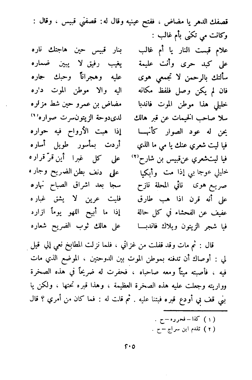 قصفك الدهر يا مضاض، ففتح عينيه وقال له: قصفني قبيس، وقال: وكانت مي تكنى بأم غالب: