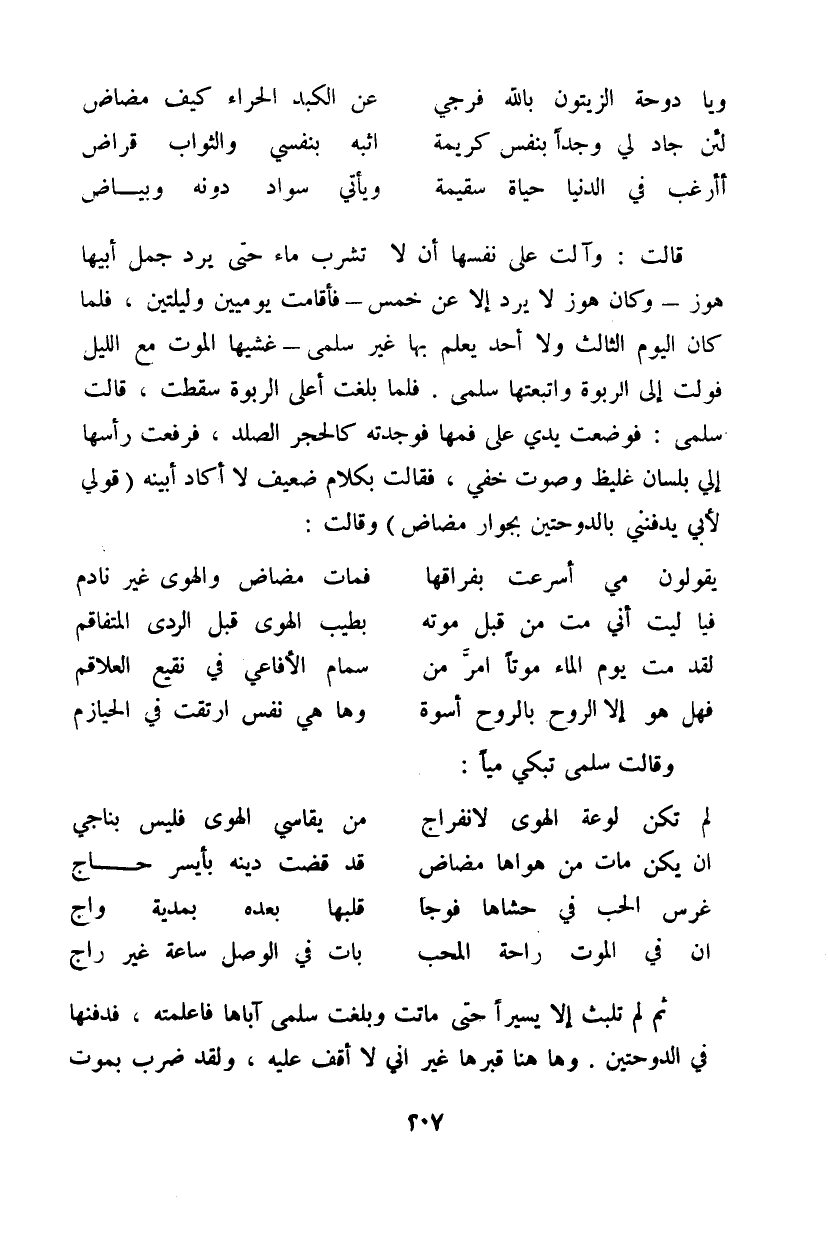 قالت: وآلت على نفسها أن لا تشرب ماء حتى يرد جمل أبيها هوز - وكان هوز لا يرد إلا عن خمس - فأقامت يوميين وليلتين، فلما كان يوم الثالث - ولا أحد يعلم بها غير سلمى - غشيها الموت مع الليل فولت إلى الربوة واتبعتها سلمى. فلما بلغت أعلى الربوة سقطت، قال سلمى: فوضعت يدي على فمها فوجدته كالحجر الصلد، فرفعت رأسها إلي بلسان غليظ وصوت خفي، فقالت بكلام ضعيف لا أكاد أبينه (قولي لأبي يدفنني بالدوحتين بجوار مضاض) وقالت: