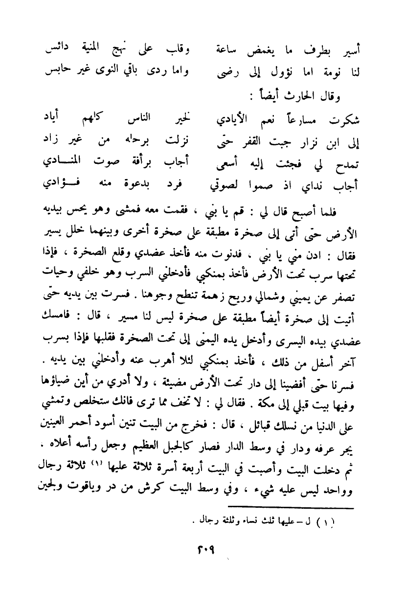 فلما أصبح قال لي: قم يا بني، فقمت معه فمشى وهو يحس بيديه الأرض حتى أتى إلى صخرة مطبقة على صخرة أخرى وبينهما خلل يسير فقال: ادن مني يا بني، فدنوت منه فأخذ عضدي وقلع الصخرة، فإذا تحتها سرب تحت الأرض فأخذ بمنكبي فأدخلني السرب وهو خلفي وحيات تصفر عن يميني وشمالي وريح زهمة تنطح وجوهنا. فسرت بين يديه حتى أتيت إلى صخرة أيضاً مطبقة على صخرة ليس لنا مسير، قال: فامسك عضدي بيده اليسرى وأدخل يده اليمنى إلى تحت الصخرة فقلبها فإذا بسرب آخر أسفل من ذلك، فأخذ بمنكبي لئلا أهرب عنه وأدخلني بين يديه. فسرنا حتى أفضينا إلى دار تحت الأرض مضيئة، ولا أدري من أين ضياؤها وفيها بيت قبلي إلى مكة. فقال لي: لا تخف مما ترى فانك ستخلص وتمشي على الدنيا من نسلك قبائل، قال: فخرج من البيت تنين أسود أحمر العينين يجر عرفه ودار في وسط الدار فصار كالجبل العظيم وجعل رأسه أعلاه. ثم دخلت البيت وأصبت في البيت أربعة أسرة ثلاثة عليها ثلاثة رجال وواحد ليس عليه شيء، وفي وسط البيت كرش من در وياقوت ولجين