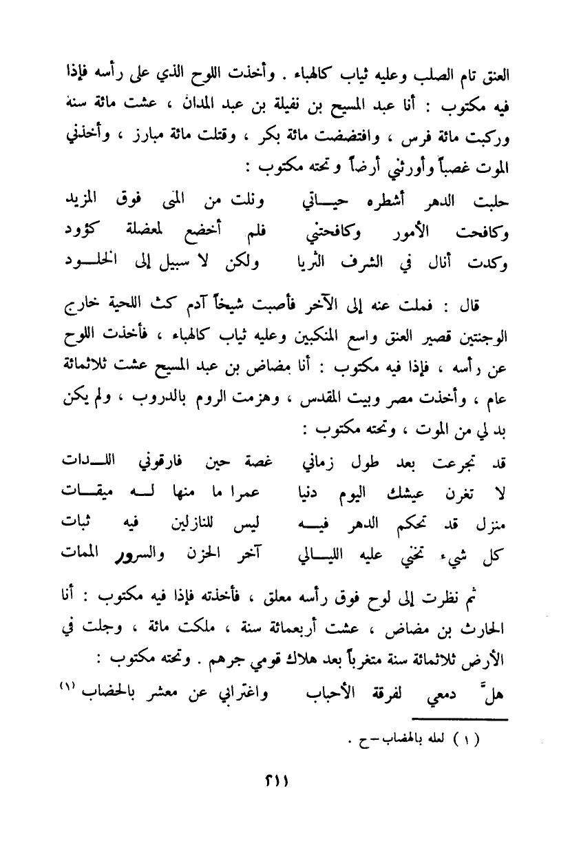 قال: فملت عنه إلى الآخر فأصبت شيخاً آدم كث اللحية خارج الوجنتين قصير العنق واسع المنكبين وعليه ثياب كالهباء، فأخذت اللوح عن رأسه، فإذا فيه مكتوب: أنا مضاض بن عبد المسيح عشت ثلاثمائة عام، وأخذت مصر وبيت المقدس، وهزمت الروم بالدروب، ولم يكن بد لي من الموت، وتحته مكتوب: