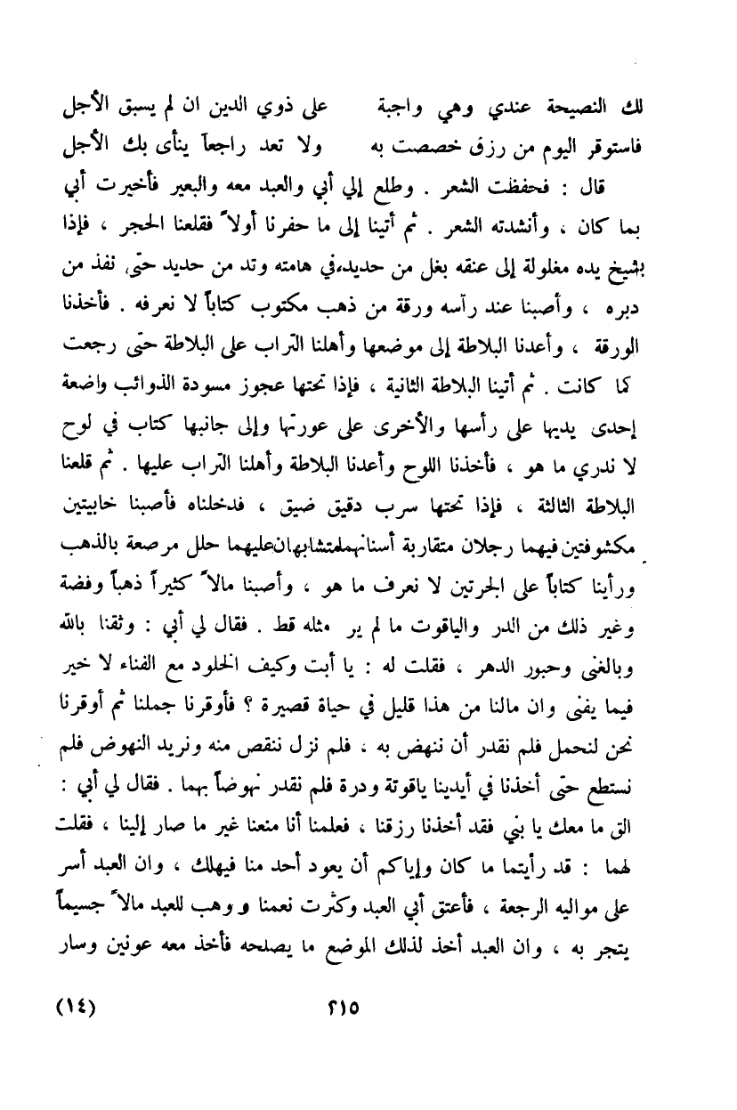 قال: فحفظت الشعر. وطلع إلي أبي والعبد معه والبعير فأخبرت أبي بما كان، وأنشدته الشعر. ثم أتينا إلى ما حفرنا أولاً فقلعنا الحجر، فإذا بشيخ يده مغلولة إلى عنقه بغل من حديد، في هامته وتد من حديد حتى نفذ من دبره، وأصبنا عند رأسه ورقه من ذهب مكتوب كتاباً لا نعرفه. فأخذنا الورقة، وأعدنا البلاطة إلى موضعها وأهلنا التراب على البلاطة حتى رجعت كما كانت. ثم أتينا البلاطة الثانية، فإذا تحتها عجوز مسودة الذوائب واضعة إحدى يديها على رأسها والأخرى على عورتها وإلى جانبها كتاب في لوح لا ندري ما هو، فأخذنا اللوح وأعدنا البلاطة وأهلنا التراب عليها. ثم قلعنا البلاطة الثالثة، فإذا تحتها سرب دقيق ضيق، فدخلناه فأصبنا خابيتين مكشوفتين فيهما رجلان متقاربة أسنانهما متشابهان عليهما حلل مرصعة بالذهب ورأينا كتاباً على الجرتين لا نعرف ما هو، وأصبنا مالاً كثيراً ذهباً وفضة وغير ذلك من الدر والياقوت ما لم ير مثله قط. فقال لي أبي: وثقنا بالله وبالغنى وحبور الدهر، فقلت له: يا أبت وكيف الخلود مع الفناء لا