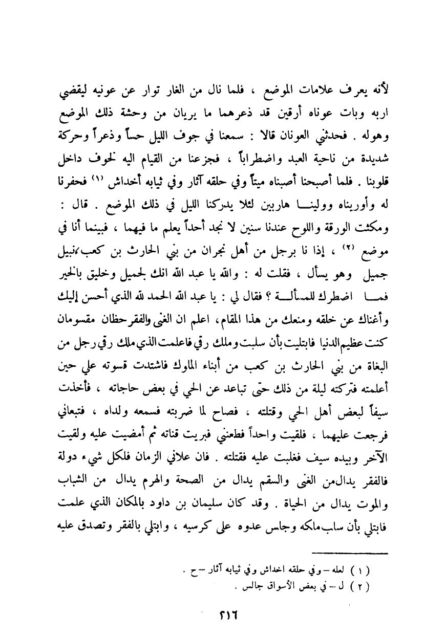 لأنه يعرف علامات الموضع، فلما نال من الغار توار عن عونيه ليقضي أربه وبات عوناه أرقين قد ذعرهما ما يريان من وحشة ذلك الموضع وهوله. فحدثني العونان قالا: سمعنا في جوف الليل حساً وذعراً وحركة شديدة من ناحية العبد واضطراباً، فجزعنا من القيام إليه لخوف داخل قلوبنا. فلما أصبحنا أصبناه ميتاً وفي حلقة آثار وفي ثيابه أخداش فحفرنا له وأوريناه وولينا هاربين لئلا يدركنا الليل في ذلك الموضع. قال: ومكثت الورقة واللوح عندنا سنين لا نجد أحداً يعلم ما فيهما، فبينما أنا في موضع، إذا أنا برجل من أهل نجران من بني الحارث بن كعب، نبيل جميل وهو يسأل، فقلت له: والله يا عبد الله انك لجميل وخليق بالخير فما اضطرك للمسألة؟ فقال لي: يا عبد الله الحمد لله الذي أحسن أبيك وأغناك عن خلقه ومنعك من هذا المقام، اعلم إن الغنى والفقر حظان مقسومان كنت عظيم الدنيا فابتليت بأن سلبت وملك رقي فأعلمت الذي ملك رقي رجل من البغاة من بني الحارث بن كعب من أبناء الملوك فاشتدت قسوته علي حين أعلمته فتركته ليلة من ذلك حتى تباعد عن الحي في بعض حاجاته، فأخذت سيفاً لبعض أهل الحي وقتلته، فصاح لما ضربته فسمعه ولداه، فتبعاني فرجعت عليهما، فلقيت واحداً فطعنني فبريت قناته ثم أمضيت عليه ولقيت الآخر وبيده سيف فغلبت عليه فقتلته. فإن علاني الزمان فلكل شيء دولة