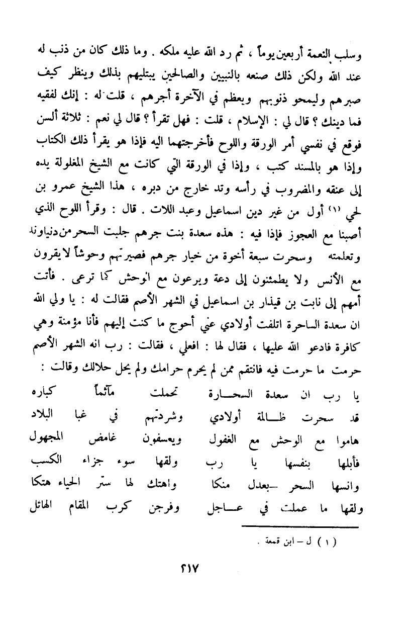 وسلب النعمة أربعين يوماً، ثم رد الله عليه ملكه. وما ذلك كان من ذنب له عند الله ولكن ذلك صنعه بالنبيين والصالحين يبتليهم بذلك وينظر كيف صبرهم وليمحو ذنوبهم ويعظم في الآخرة أجرهم، قلت له: إنك لفقيه فما دينك؟ قال لي: الإسلام، قلت: فهل تقرأ؟ قال لي نعم: ثلاثة ألسن فوقع في نفسي أمر الورقة واللوح فأخرجتهما إليه فإذا هو يقرأ ذلك الكتاب وإذا هو بالمسند كتب، وإذا في الورقة التي كانت مع الشيخ المغلولة يده إلى عنقه والمضروب في رأسه وتد خارج من دبره، هذا الشيخ عمرو بن لحي أول من غير دين إسماعيل وعبد اللات. قال: وقرأ اللوح الذي أصبنا مع العجوز فإذا فيه: هذه سعدة بنت جرهم جلبت السحر من دنيا وند وتعلمته وسحرت سبعة أخوة من خيار جرهم فصيرتهم وحوشاً لا يقرون مع الأنس ولا يطمئنون إلى دعة ويرعون مع الوحش كما ترعى. فأتت أمهم إلى نابت بن قيذار بن إسماعيل في الشهر الأصم فقالت له: يا ولي الله إن سعدة الساحرة أتلفت أولادي عني أحوج ما كنت إليهم فأنا مؤمنة وهي كافرة فادعوا الله عليها، فقال لها: افعلي، فقالت: رب إنه الشهر الأصم حرمت ما حرمت فيه فانتقم ممن لم يحرم حرامك ولم يحل حلالك وقالت: