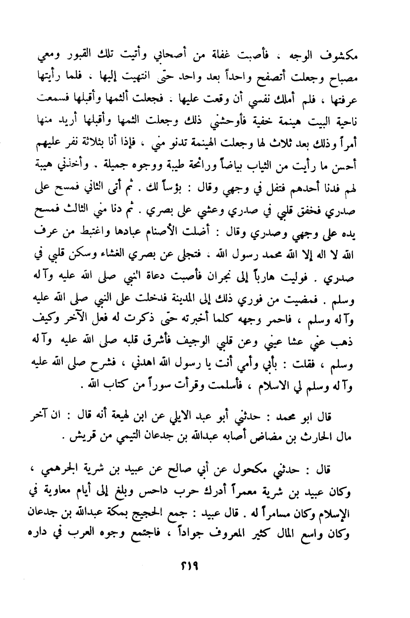 أتصفح واحداً بعد واحد حتى انتهت إليها، فلما رأيتها عرفتها، فلم أملك نفسي أن وقعت عليها، فجعلت ألثمها وأقبلها فسمعت ناحية البيت هينمة خفية فأوحشني ذلك وجعلت الثمها وأقبلها أريد منها أمراً وذلك بعد ثلاث لها وجعلت الهينمة تدنو مني، فإذا أنا بثلاثة نفر عليهم أحسن ما رأيت من الثياب بياضاً ورائحة طيبة ووجوه جميلة، وأخذني هيبة لهم فدنا أحدهم فتفل في وجهي وقال: بؤساً لك. ثم أتى الثاني فمسح على صدري فخفق قلبي في صدري وعشي علي بصري. ثم دنا مني الثالث فمسح يده على وجهي وصدري وقال: أضلت الأصنام عبادها واغتبط من عرف الله لا اله إلا الله محمد رسول الله، فتجلى عن بصري الغشاء وسكن قلبي في صدري. فوليت هارباً إلى نجران فأصبت دعاة النبي صلى الله عليه وآله وسلم. فمضيت من فوري ذلك إلى المدينة فدخلت على النبي صلى الله عليه وآله وسلم، فاحمر وجهه كلما أخبرته حتى ذكرت له فعل الآخر وكيف ذهب عني عشا عيني وعن قلبي الوجيف فأشرق قلبه صلى الله عليه وآله وسلم، فقلت: بأبي وأمي أنت يا رسول الله أهدني، فشرح صلى الله عليه وآله وسلم لي الإسلام، فأسلمت وقرأت سوراً من كتاب الله.