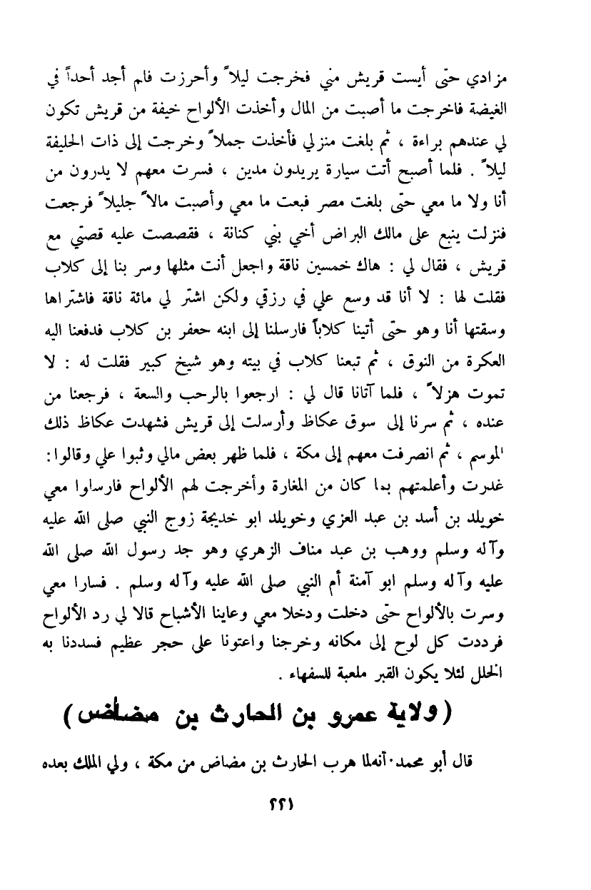 جليلاً فرجعت فنزلت ينبع على مالك البراض أخي بني كنانة، فقصصت عليه قصتي مع قريش، فقال لي: هاك خمسين ناقة واجعل أنت مثلها وسر بنا إلى كلاب فقلت لها: لا أنا قد وسع علي في رزقي ولكن اشتر لي مائة فاشتراها وسقتها أنا وهو حتى أتينا كلاباً فأرسلنا إلى ابنه جعفر بن كلاب فدفعنا إليه العكرة من النوق، ثم تبعنا كلاب في بيته وهو شيخ كبير فقلت له: لا تموت هزلاً، فلما آتانا قال لي: ارجعوا بالرحب والسعة، فرجعنا من عنده، ثم سرنا إلى سوق عكاظ وأرسلت إلى قريش فشهدت عكاظ ذلك الموسم، ثم انصرفت معهم إلى مكة، فلما ظهر بعض مالي وثبوا علي وقالوا: غدرت وأعلمتهم بما كان من المغارة وأخرجت لهم الألواح فأرسلوا معي خويلد بن أسد بن عبد العزي وخويلد أبو خديجة زوج النبي صلى الله عليه وآله وسلم ووهب بن عبد مناف الزهري وهو جد رسول الله صلى الله عليه وآله وسلم أبو آمنة أم النبي صلى الله عليه وآله وسلم. فسارا معي وسرت بالألواح حتى دخلت ودخلا معي وعاينا الأشباح قالا لي رد الألواح فرددت كل لوح إلى مكانه وخرجنا واعتونا على حجر عظيم فسددنا به الخلل لئلا يكون القبر ملعبة للسفهاء.