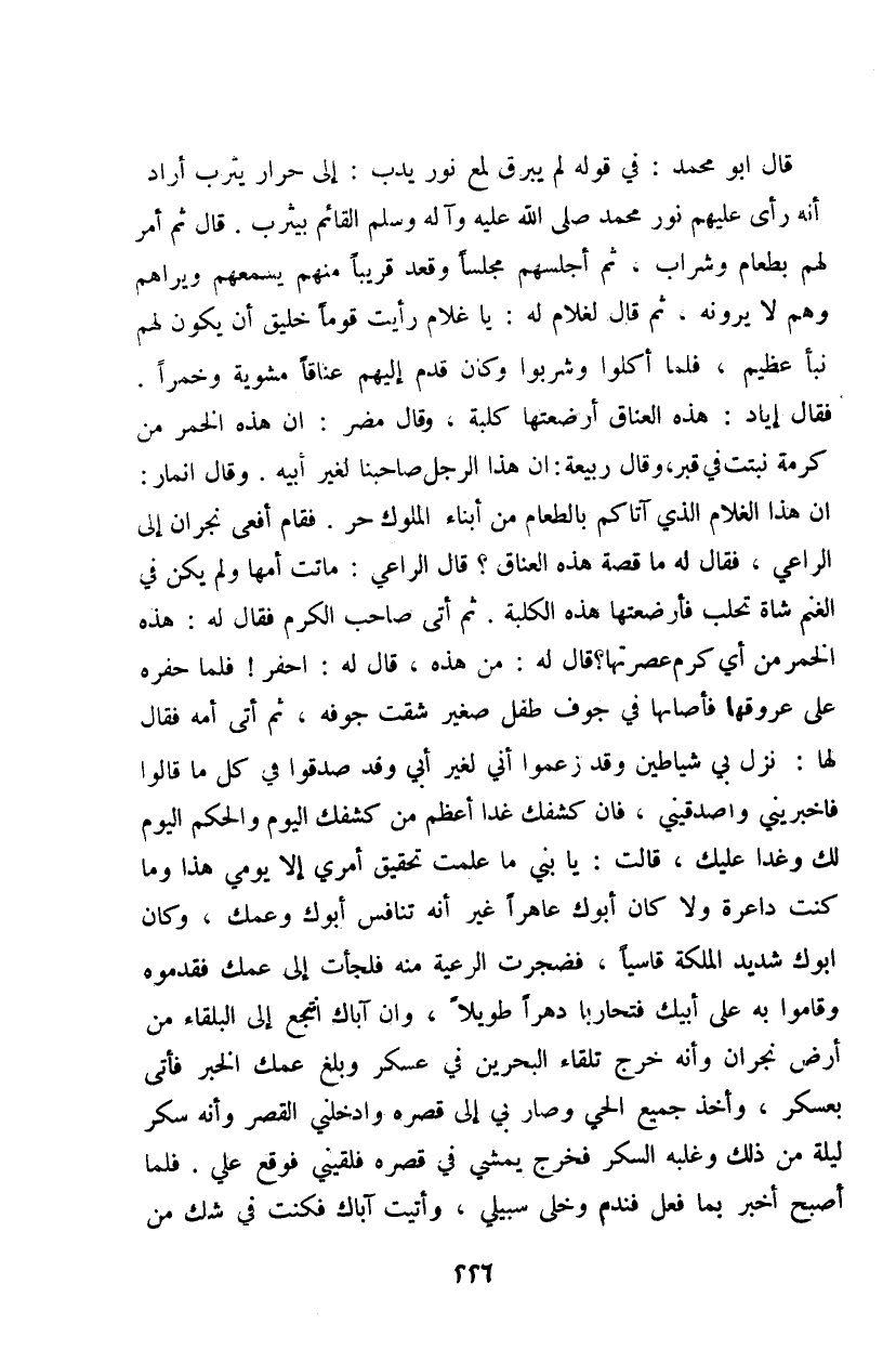 قال أبو محمد: في قوله لم يبرق لمع نور يدب: إلى حرار يثرب أراد إنه رأى عليهم محمد صلى الله عليه وآله وسلم القائم بيثرب. قال ثم أمر لهم بطعام وشراب، ثم أجلسهم مجلساً وقعد قريباً منهم يسمعهم ويراهم وهم لا يرونه، ثم قال لغلام له: يا غلام رأيت قوماً خليق أن يكون لهم نبأ عظيم، فلما أكلوا وشربوا وكان قدم إليهم عناقاً مشوية وخمراً. فقال إياد: هذه العناق أرضعتها كلبة، وقال مضر: إن هذه الخمر من كرمة نبتت في قبر، وقال ربيعة: إن هذا الرجل صاحبنا لغير أبيه، وقال انمار: إن هذا الغلام الذي آتاكم بالطعام من أبناء الملوك الحر. فقام أفعى نجران إلى الراعي، فقال له ما قصة هذه العناق؟ قال الراعي: ماتت أمها ولم يكن في الغنم شاة تحلب فأرضعتها هذه الكلبة. ثم أتى صاحب الكرم فقال له: هذه الخمر من أي كرم عصرتها؟ قال له: من هذه، قال له: احفر! فلما حفر على عروقها فأصابها في جوف طفل صغير شقيت جوفه، ثم أتى أمه فقال لها: نزل بي شياطين وقد زعموا أني لغير أبي وقد صدقوا في كل ما قالوا فاخبريني واصدقيني، فإن كشفك غدا أعظم من كشفك اليوم والحكم اليوم لك وغدا عليك، قال: يا بني ما عملت تحقيق أمري ألا يومي هذا وما كنت داعرة ولا كان