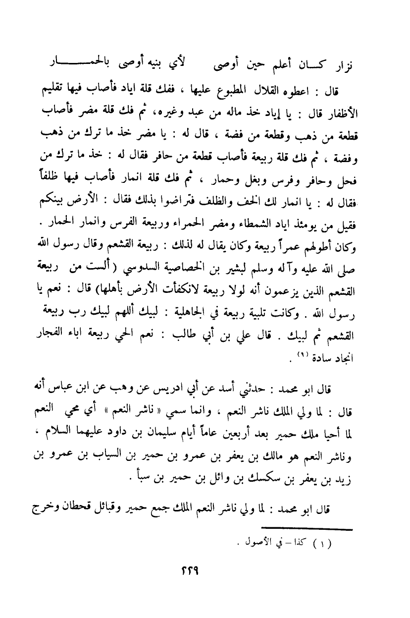قال: أعطوه القلال المطبوع عليها، ففك قلة إياد فأصاب فيها تقليم الأظفار قال: يا إياد خذ ماله من عبد وغيره، ثم فك قلة مضر فأصاب قطعة من ذهب وقطعة من فضة، قال له: يا مضر خذ ما ترك من ذهب وفضة، ثم فك قلة ربيعة فأصاب قطعة مة حافر فقال له: خذ ما ترك من فحل وحافر وفرس وبغل وحمار، ثم فك قلة انمار فأصاب فيها ظلفاً فقال له: يا انمار لك الخف والظلف فتراضوا بذلك فقال: الأرض بينكم فقيل من يومئذ إياد الشمطاء ومضر الحمراء وربيعة الفرس وانمار الحمار. وكان أطولهم ربيعة وكان يقال له لذلك: ربيعة القشعم وقال رسول الله صلى الله عليه وآله وسلم لبشير بن الخصاصية السدوسي (ألست من ربيعة القشعم اللذين يزعمون إنه لولا ربيعة لانكفأت الأرض بأهلها) قال: نعم يا رسول الله. وكانت تلبية ربيعة في الجاهلية: لبيك ألهم لبيك رب ربيعة القشعم ثم لبيك. قال علي بن أبي طالب: نعم الحي ربيعة إباء الفجار أنجاد سادة.