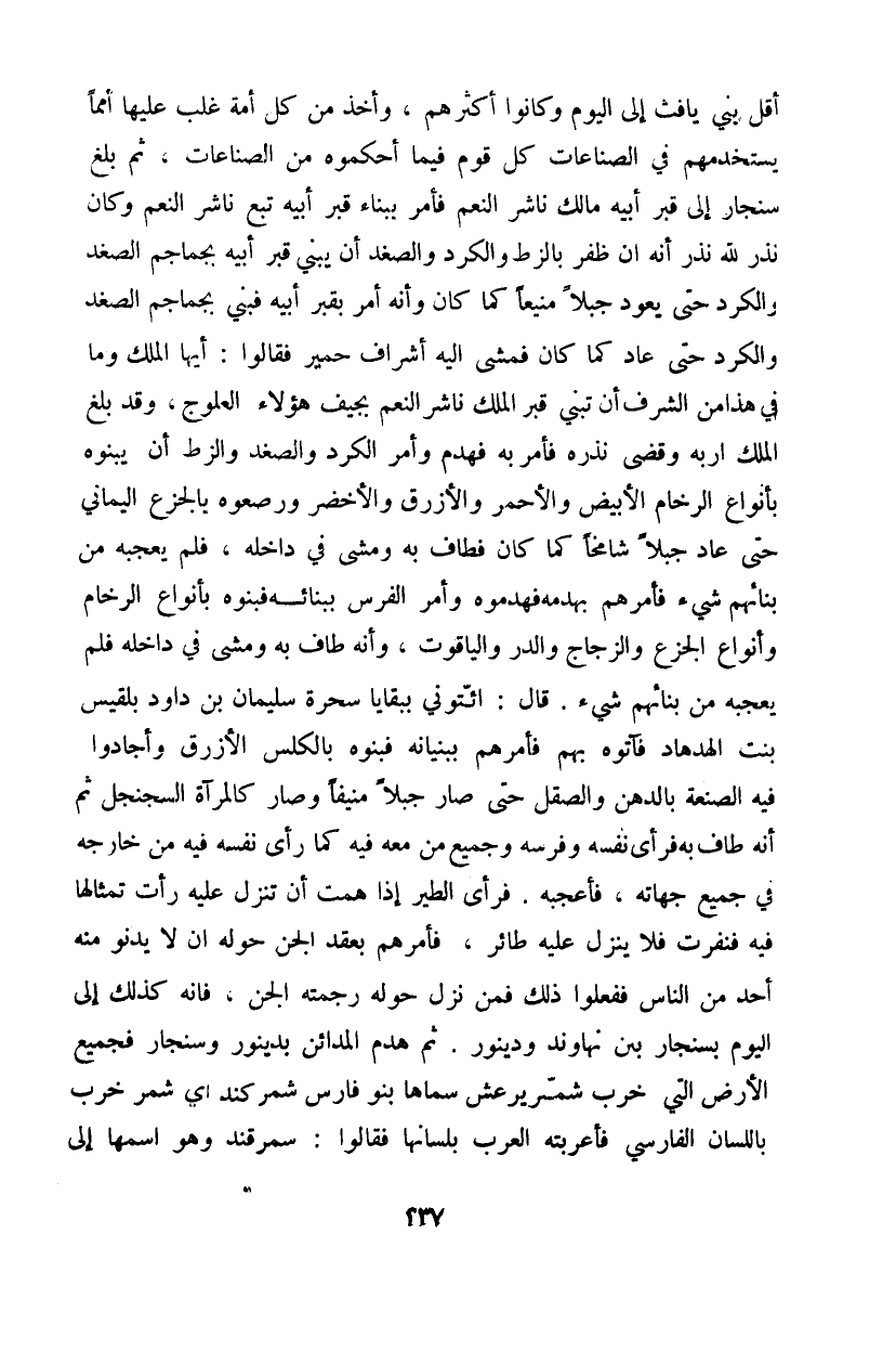 أقل بني يافث إلى اليوم وكانوا أكثرهم، وأخذ من كل أمة غلب عليها أمماً يستخدمهم في الصناعات كل قوم فيما أحكموه فيما أحكموه من الصناعات، ثم بلغ سنجار إلى قبر أبيه مالك ناش النعم فأمر ببناء قبر أبيه تبع ناشر النعم وكان نذر لله إنه إن ظفر بالزط والكرد والصغد أن يبني قبر أبيه بجماجم الصغد والكرد حتى يعود جبلاً منيعاً كما كان وأنه أمر بقبر أبيه فبني بجماجم الصغد والكرد حتى عاد كما كان فمشى إليه أشراف حمير فقالوا: أيها الملك وما في هذا من الشرف أن تبني قبر الملك ناشر النعم بجيف هؤلاء العلوج، وقد بلغ الملك أربه وقضى نذره فأمر به فهدم وأمر الكرد والصغد والزط أن يبنوه بأنواع الرخام الأبيض والأحمر والأزرق والأخضر ورصعوه بالجزع اليماني حتى عاد جبلاً شامخاً كما كان فطاف به ومشى في داخله، فلك يعجبه من بنائهم شيء فأمرهم يهدمه فهدموه وأمر الفرس ببنائه فينوه بأنواع الرخام وأنواع الجزع والزجاج والدر والياقوت، وأنه طاف به ومشى في داخله فلم يعجبه من بنائهم شيء. قال: ائتوني ببقايا سحرة سليمان بن داود بلقيس بنت الهدهاد فآتوه بهم فأمرهم ببنيانه فينوه بالكلس الأزرق وأجادوا فيه الصنعة بالدهن والصقل حتى صار جبلاً منيفاً وصار كالمرآة السجنجل ثم إنه طاف به فرأى نفسه وفرسه وجميع من معه فيه كما رأى نفسه فيه من خارجه في جميع جهاته، فأعجبه. فرأى الطير إذا همت أن