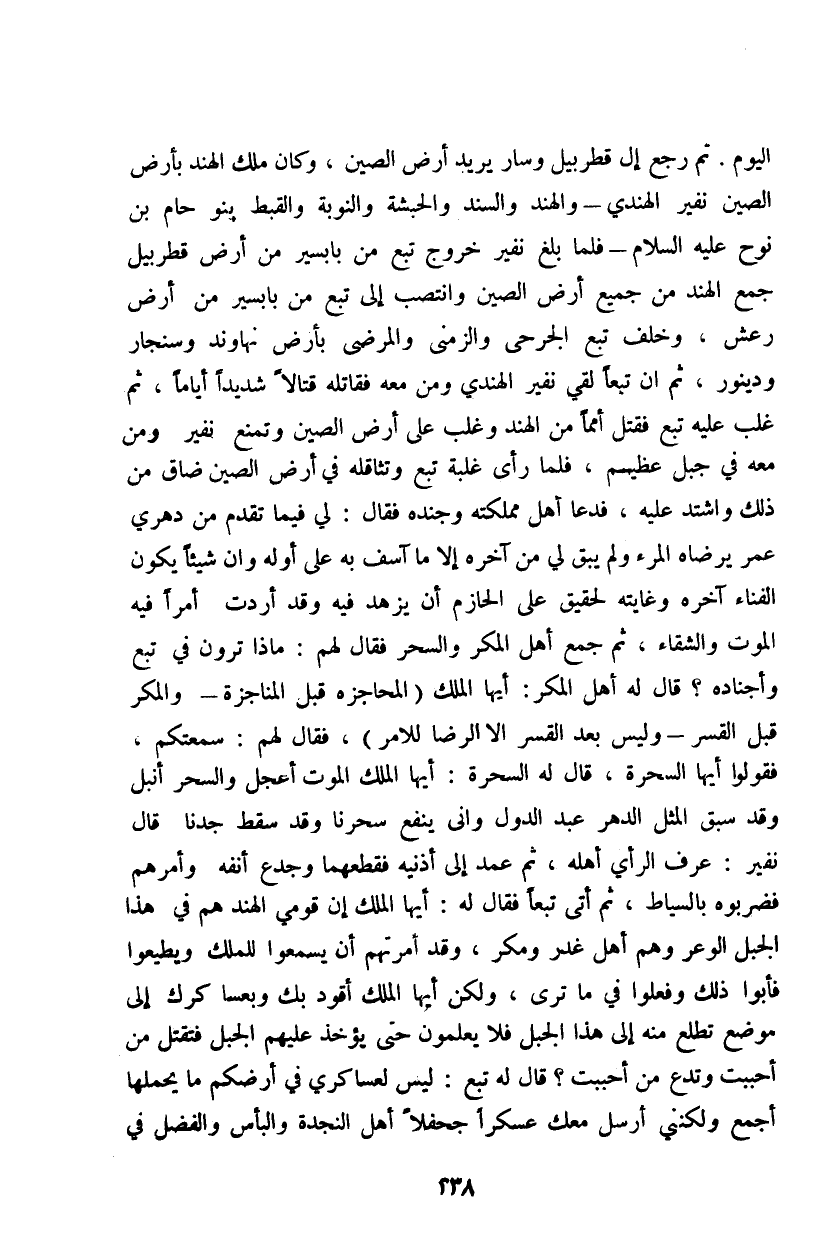 اليوم. ثم رجع إلى قطربيل وسار يريد ارض الصين، وكان ملك الهند بأرض الصين نفير الهندي - والهند والسند والحبشة والنوبة والقبط بنو حام بن نوح عليه السلام - فلما بلغ نفير خروج تبع من بابسير من ارض قطربيل جمع الهند من جميع أرض الصين وانتصب إلى تبع من بابسير من ارض وعش، وخلف تبع الجرحى والزمني والمرضى بأرض نهاوند وسنجار ودينور، ثم أن تبعاً لقي نفير العندي ومن معه فقاتله قتالاً شديداً أياماً، ثم غلب عليه تبع فقتل أمماً من الهند وغلب على أرض الصين وتمنع نفير ومن معه في جبل عظيم، فلما رأى غلبة تبع وتثاقله في أرض الصين ضاق من ذلك واشتد عليه، فدعا آهل مملكته وجنده فقال: لي فيما تقدم من دهري عمر يرضاه المرء لم يبق لي من آخره إلا ما آسف به على أوله وإن شيئاً يكون الفناء آخره وغايته لحقيق على الحازم أن يزهد فيه وقد أردت أمراً فيه الموت والشقاء، ثم جمع أهل المكر والسحر فقال لهم: ماذا ترون في تبع وأجناده؟ قال له أهل المكر: أيها الملك (المحاجزه قبل المناجزة - والمكر قبل القسر - وليس بعد القسر إلا الرضا للأمر)، فقال لهم: سمعتكم، فقالوا أيها السحرة، قال له السحرة: أيها الملك الموت أعجل والسحر أنبل وقد سبق المثل الدهر عبد الدول وأنى ينفع سحرنا وقد سقط جدنا قال نفير: عرف الرأي أهله، ثم عمد إلى أذنيه فقطعهما وجدع انفه وأمرهم فضربوه بالسياط، ثم أتى تبعاً فقال له: أيها الملك إن قومي الهند هم في هذا الجبل الوعر وهم أهل غدر ومكر،
