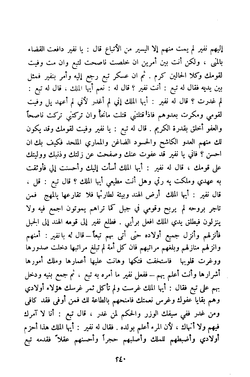 إليهم نفير لم يمت منهم إلا اليسير من الأتباع قال: يا نفير دافعت القضاء بالمنى، ولكن أنت بين أمرين إن خلصت ناصحت لتبع وإن مت وفيت لقومك وكلا الحالين كرم. ثم إن عسكر تبع رجع إليه وأمر بنفير فمثل بين يديه فقال له تبع: أنت نفير؟ قال له: نعم أيها الملك، قال له تبع: لم غدرت؟ قال له نفير: أيها الملك إني لم أغدر لأني لم أعهد بل وفيت لقومي ومكرت بعدوهم فإذا قتلتني قتلت مانحاً وإن تركتني تركت ناصحاً والعفو أخلق بقدرة الكريم. قال له تبع: يا نفير وفيت لقومك وقد يكون لك منهم العدو الكاشح والحسود الضاغن والمماري الملحد فكيف بك أن أحسن؟ فاني يا نفير قد عفوت عنك وصفحت عن زلتك وذنبك ووليتك على قومك، قال له نفير: أيها الملك أسأت إليهم وأحسنت إلي فأوثقت به عهدي وملكت به رقي وهل أنت مطيعي أيها الملك؟ قال تبع: قل، قال نفير: أيها الملك أرض الهند وبيئة لطارئها فلا تقارعها بالمهج فمن تاجر بروحه لم يربح وقومي في جبل كما تراهم يموتون اجمع فيه ولا ينزلون فيطلق يدي الملك افعل برأيي. فطلع نفير إلى قومه الهند إلى الجبل فأنزلهم وأنزل جميع أولاده حتى أتى بهم تبعاً - قال له يا نفير: أمنهم وأنزلهم منازلهم وبلغهم مراتبهم فإن كل أمة لم تبلغ مراتبها دخلت صدورها ووغرت قلوبها فاستخفت فتكها وهانت عليها أعمارها وملك أمورها أشرارها وأنت أعلم بها - ففعل نفير ما أمره به تبع، ثم جمع بنيه ودخل بهم على تبع فقال: أيها الملك غرست ولم تأكل ثمر غرسك هؤلاء أولادي وهم بقايا عفوك وغرس نعمتك فامنحهم بالطاعة لك فمن أوفى فقد كافى ومن غدر ففي سيفك الوزر والحكم لمن غدر، قال تبع: أنا لا آمرك فيهم ولا أنهاك، لأن المرء أعلم بولده. فقال له نفير: أيها الملك هذا أحزم أولادي وأضبطهم للملك وأصلبهم حجراً وأحسنهم عقلاً فقدمه تبع
