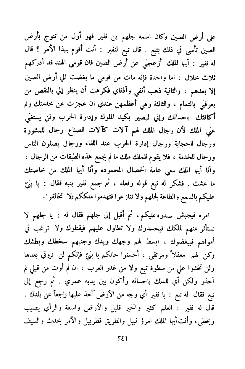 من تتوج بأرض الصين تأسى في ذلك بتبع. قال تبع لنفير: أنت أقوم بهذا الأمر؟ قال له نفير: أيها الملك أزعجني عن أرض الصين فإن قومي الهند قد أدركهم ثلاث خلال: أما واحدة فإنه مات من قومي ما بغضت إلي أرض الصين إلا بعدهم، والثانية ذهب أنفي وأذناي فكرهت أن ينظر إلي بالنقص من يعرفني بالتمام، والثالثة وهي أعظمهن عندي إن عجزت عن خدمتك لم أكافئك بإحسانك وإني لبصير بكيد الملوك وإدارة الحرب ولن يستغنى عني الملك لأن رجال الملك لهم آلات كآلات الصناع رجال للمشورة ورجال للحجاجة ورجال إدارة الحرب عند اللقاء ورجال يصلون الناس ورجال للخدمة، فلا يقوم للملك ملك ما لم يجمع هذه الطبقات من الرجال، وأنا أيها الملك معي عامة الخصال المحمودة وأنا أيها الملك من خاصتك ما عشت. فشكر له تبع قوله وفعله، ثم جمع نفير بنيه فقال: يا بني عليكم بالسمع والطاعة لجلهم ولا تنازعوا فتهدموا ملككم ولا تخالفوا.