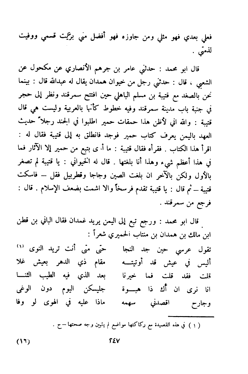 قال أبو محمد: حدثني عامر بن جرهم الأنصاري عن مكحول عن الشعبي، قال: حدثني رجل من خيوان همدان يقال له عبد الله قال: بينما نحن بالصغد مع قتبية بن مسلم الباهلي حين افتتح سمرقند ونظر إلى حجر في جنبة باب مدينة سمرقند وفيه خطوط كأنها بالعربية وليست هي قال قتيبة: والله إني لأظن هذا حمقات حمير اطلبوا في الجند رجلاً حديث العهد باليمن يعرف كتاب حمير فوجد فانطلق به إلى قتيبة فقال له: اقرأ هذا الكتاب. فقرأه فقال قتيبة: ما أرى بتبع من حمير إلا الآثار فما في هذا أعظم شيء وهذا أنا بلغتها. قال له الحيواني: يا قتيبة لم تصغر بالأول ولكن بالآخر إن بلغت الصين وجاجا وقطربيل فقل - فاسكت قتيبة - ثم قال: يا قتيبة تقدم فرسخاً وإلا اشمت بضعف الإسلام. قال: فرجع من سمرقند.