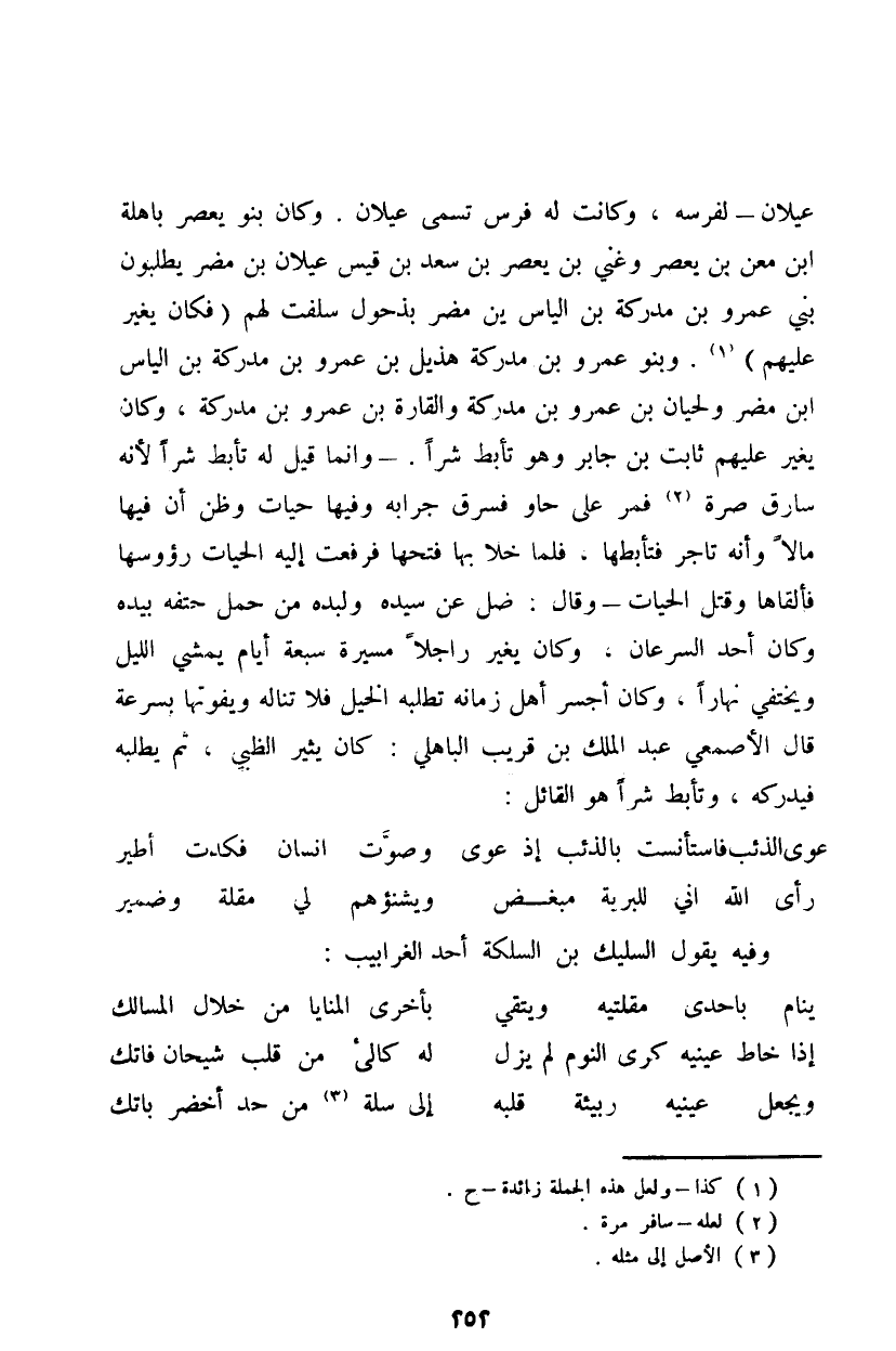 عيلان - لفرسه، وكانت له فرس تسمى عيلان. وكان بنو يعصر باهلة ابن معن بن يعصر وغني بن يعصر بن سعد بن قيس بن عيلان بن مضر يطلبون بني عمرو بن مدركة بن الياس بن مضر بذحول سلفت لهم (فكان يغير عليهم). وبنو عمرو بن مدركة هذيل بن عمرو بن مدركة بن الياس ابن مضر ولحيان بن عمرو بن مدركة والقارة بن عمرو بن مدركة، وكان يغير عليهم ثابت بن جابر وهو تأبط شراً. - وإنما قيل له تأبط شراً لأنه سارق صرة فمر على حاو فسرق جرابه وفيها حيات وظن أن فيها مالاً وانه تاجر فتأبطها. فلما خلا بها فتحها فرفعت إليه الحيات رؤوسها فألقاها وقتل الحيات - وقال: ضل عن سيده ولبده من حمل حتفه بيده وكان أحد السرعان، وكان يغير راجلاً مسيرة سبعة أيام يمشي الليل ويختفي نهاراً، وكان أجسر أهل زمانه تطلبه الخيل فلا تناله ويفوتها بسرعة قاتل الأصمعي عبد الملك بن قريب الباهلي: كان يثير الظبي، ثم يطلبه فيدركه، وتأبط شراً هو القائل: