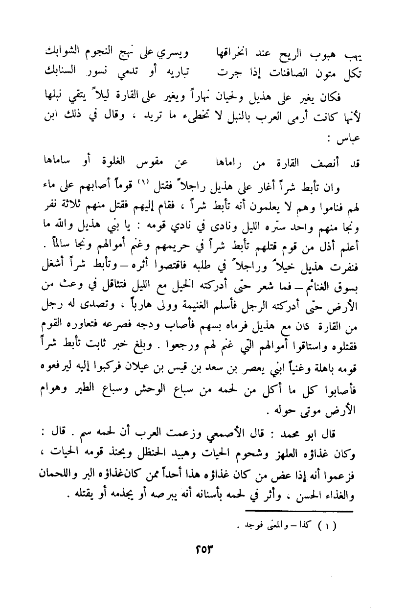 قال أبو محمد: قال الأصمعي وزعمت العرب أن لحمه سم. قال: وكان غذاؤه العلهز وشحوم الحيات وهبيد الحنظل ويحنذ قومه الحيات، فزعموا إنه إذا عض من كان غذاؤه هذا أحداً ممن كان غذاؤه البر واللحمان والغذاء الحسن، وأثر في لحمه بأسنانه إنه يبرصه أو يجذمه أو يقتله.