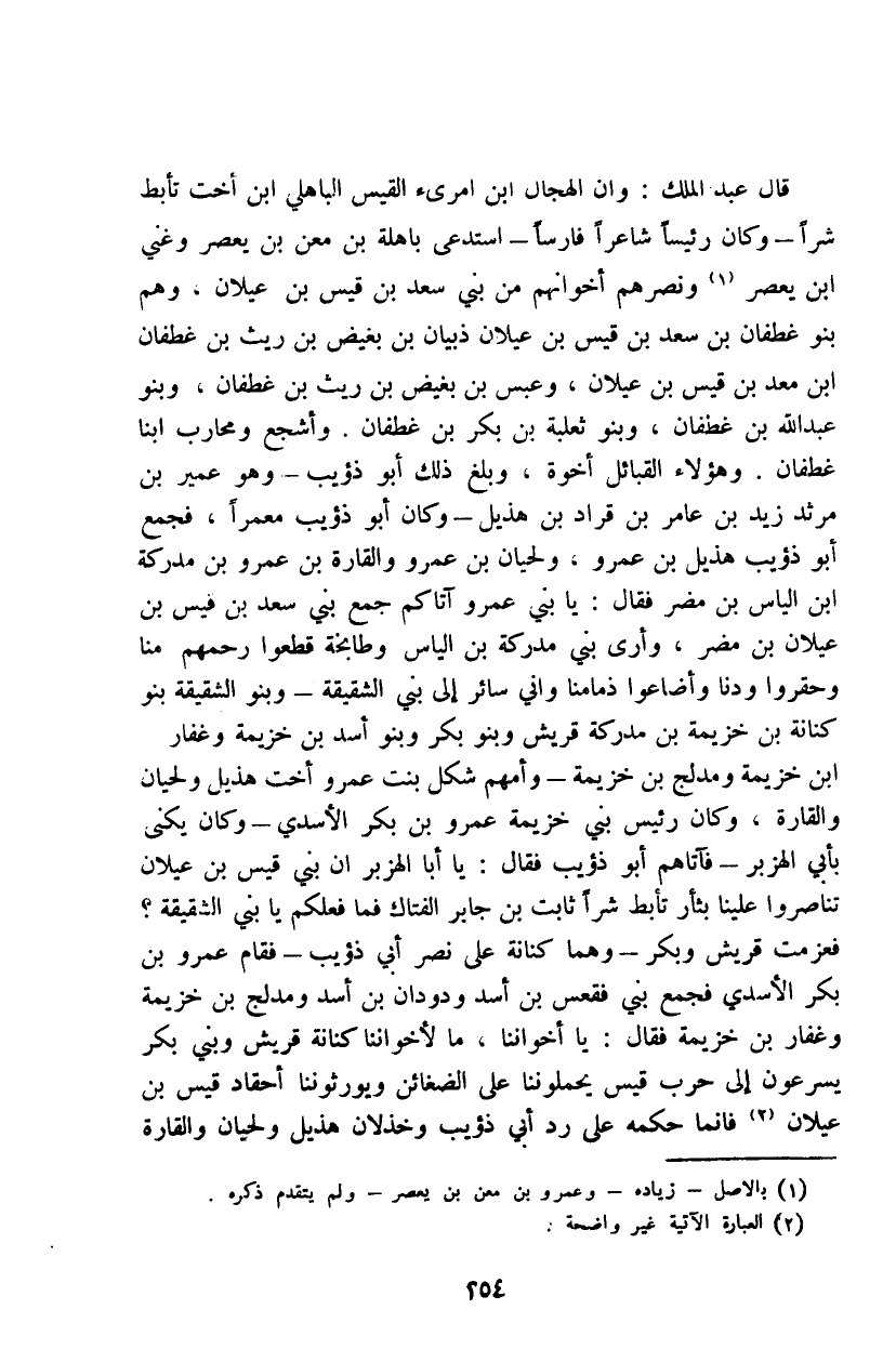 قال عبد الملك: وإن الهجال ابن امرئ القيس الباهلي ابن أخت تأبط شراً - وكان رئيساً شاعراً فارساً - استدعى باهلة بن معن بن يعصر وغني ابن يعصر ونصرهم أخوانهم من بني سعد بن قيس بن عيلان، وهم بنو غطفان بن سعد بن قيس بن عيلان ذبيان بن بغيض بن ريث بن غطفان ابن معد بن قيس بن عيلان، وعبس بن بغيض بن ريث بن غطفان، وبنو عبد الله بن غطفان، وبنو ثعلبة بن