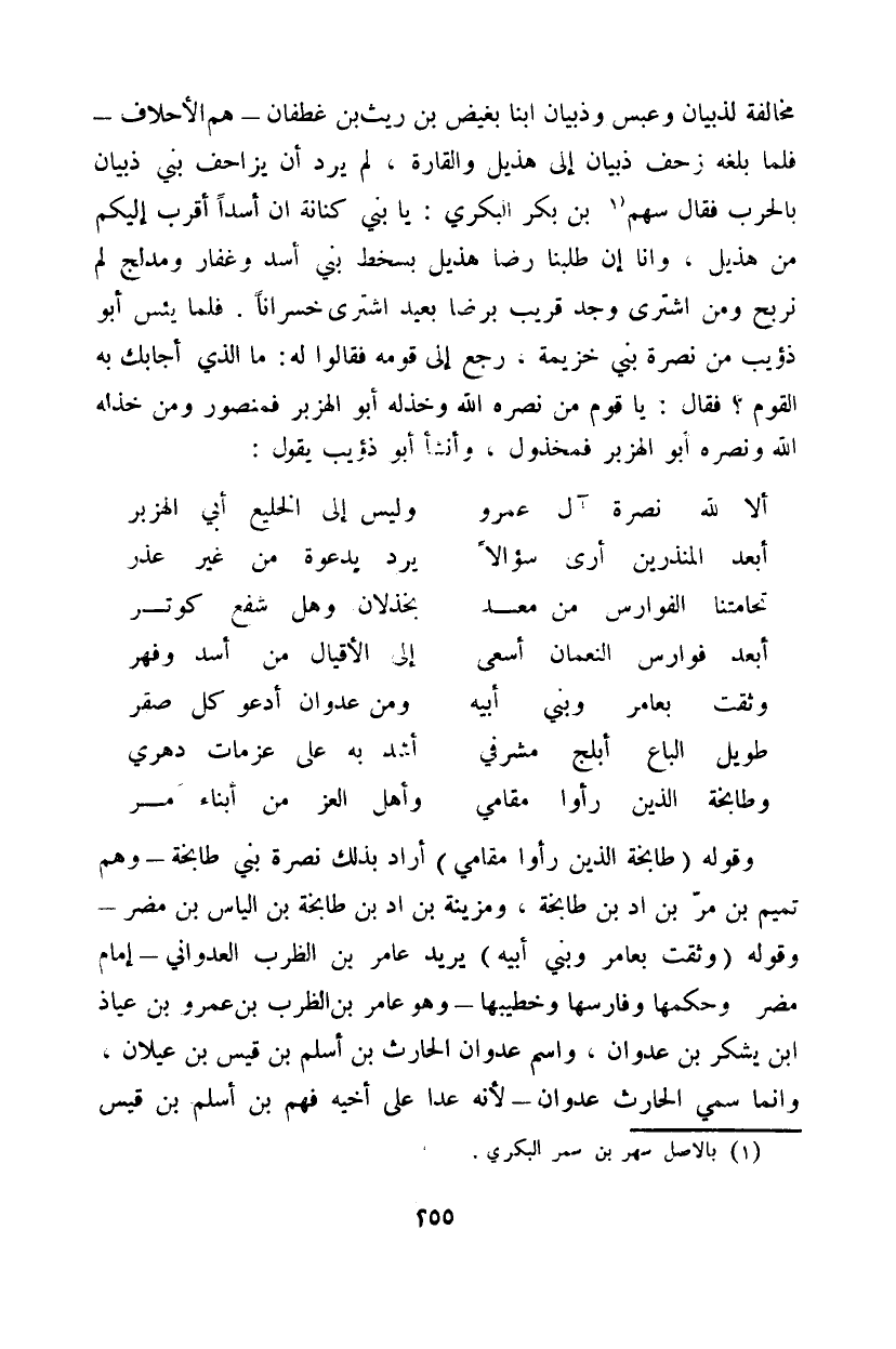 وقوله (طابخة الذين رأوا مقامي) أراد بذلك نصرة بني طابخة - وهم تميم بن مر بن اد بن طابخة، ومزينة بن اد بن طابخة بن الياس بن مضر - وقوله (وثقت بعامر وبني أبيه) يريد عامر بن الظرب العدواني - إمام مضر وحكمها وفارسها وخطيبها - وهو عامر بن الظرب بن عمرو بن عياذ ابن يشكر بن عدوان، واسم عدوان الحارث بن أسلم بن قيس بن عيلان، وإنما سمي الحارث عدوان - لأنه عدا على أخيه فهم بن أسلم بن قيس بن عيلان