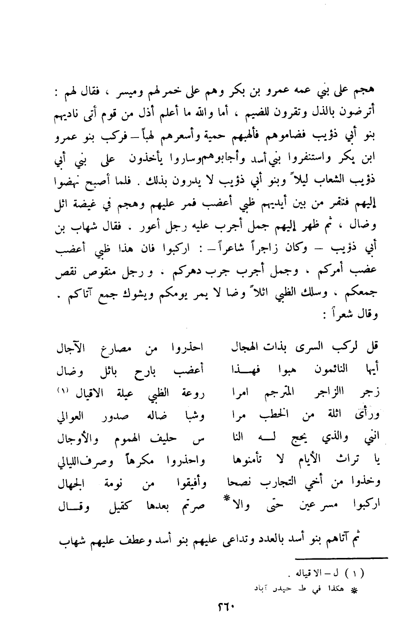 هجم على بني عمه عمرو بن بكر وهم على خمر لهم وميسر، فقال لهم: أترضون بالذل وتقرون للضيم، أما والله ما أعلم أذل من قوم أتى ناديهم بنو أبي ذؤيب فضامومهم فألهبهم حمية وأسعرهم لهباً - فركب بنو عمرو ابن بكر واستنفروا بني أسد وأجابوهم وساروا يأخذون على بني أبي ذؤيب الشعاب ليلاً وبنو أبي ذؤيب لايدرون بذلك. فلما أصبح نهضوا إليهم فنقر من بين أيديهم ظبي أعضب فمر عليهم وهجم في غيضه اثل وضال، ثم ظهر إليهم جمل أجرب عليه رجل أعور، فقال شهاب بن أبي ذؤيب - وكان زاجراً شاعراً -: اركبوا فإن هذا ظبي أعضب عضب أمركم، وجمل أجرب جرب دهركم، ورجل منقوص مقص جمعكم، وسلك الظبي أثلاً وضالا يمر يومكم ويشوك جمع آتاكم وقال شعراً: